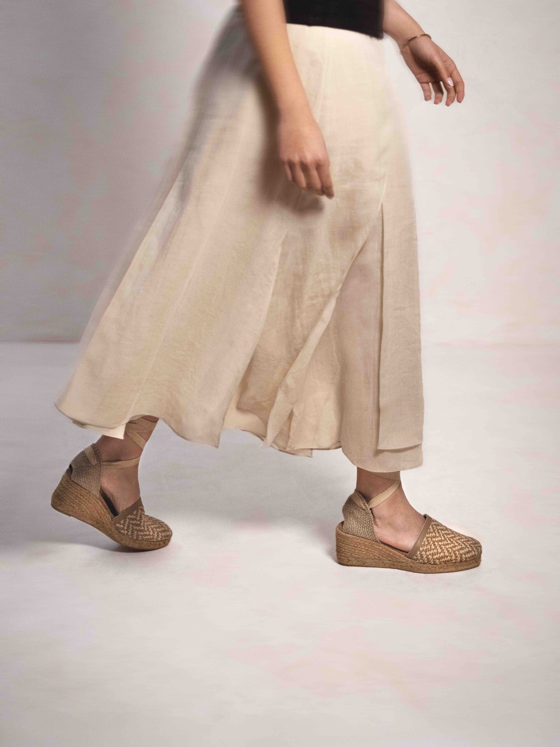 La colección se completa con una variedad de siluetas que recorren algunos de los modelos más representativos de la firma: desde la clásica alpargata con cuña y cintas atadas al tobillo, hasta sandalias con hebillas, merceditas o mocasines. Una selección que refleja la diversidad del universo Toni Pons.