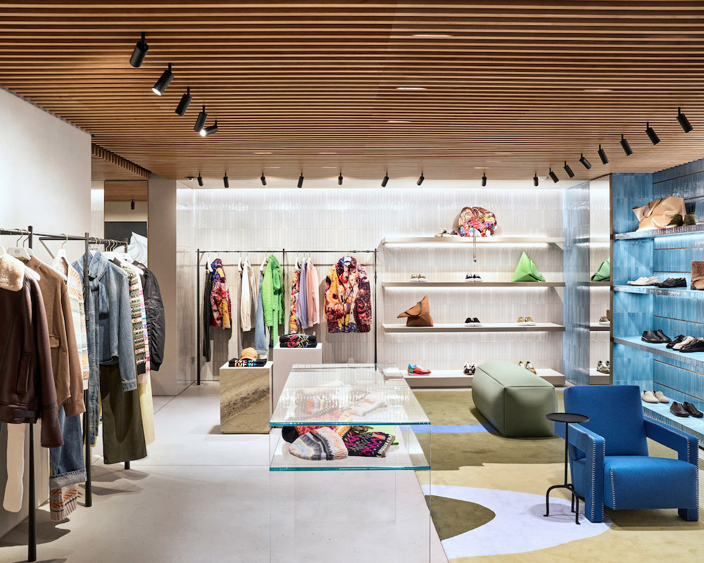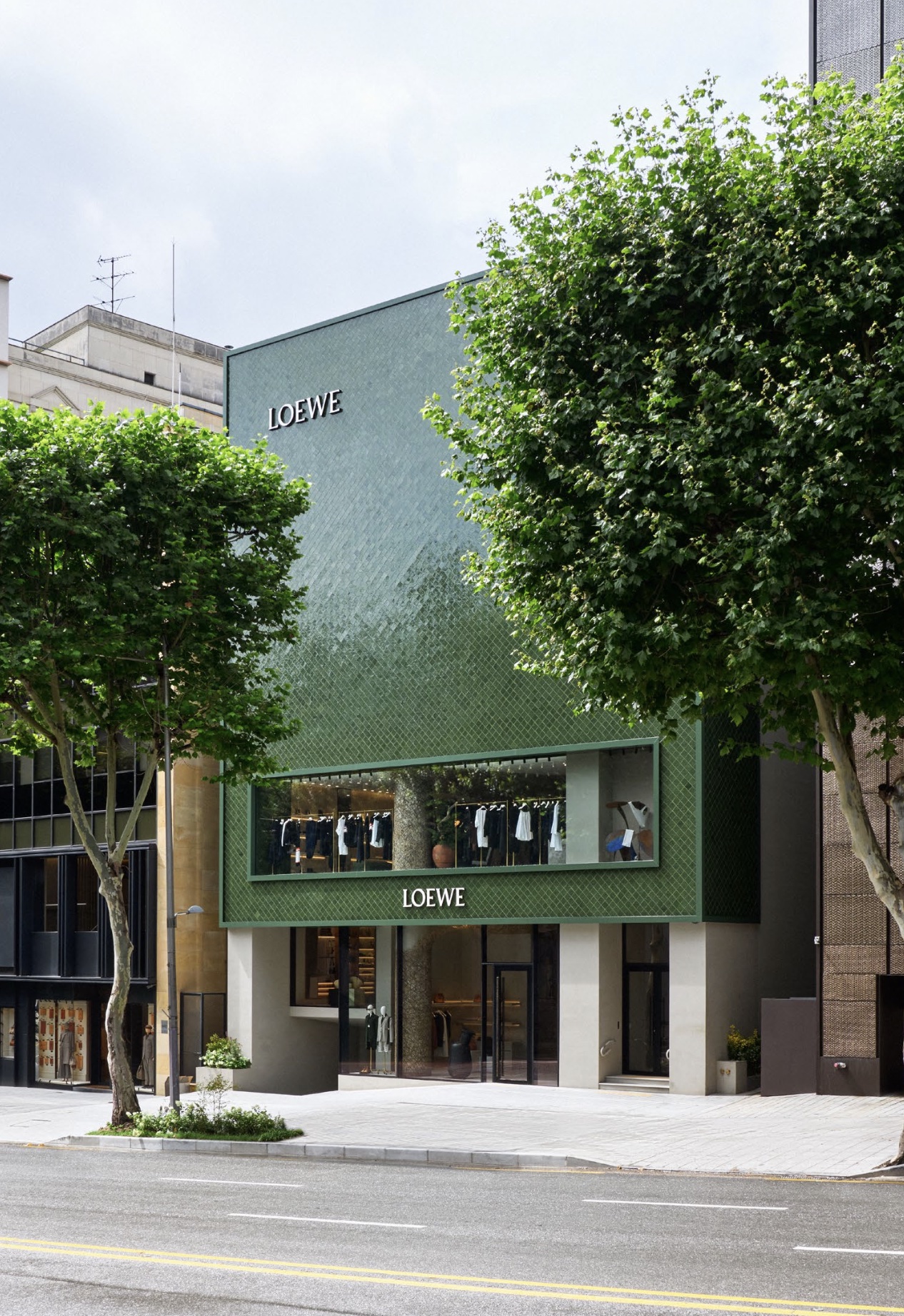 Con su brillante fachada de cerámica verde y su vasta instalación escultórica, CASA LOEWE Seúl Cheongdam es un destino singular: encarna el particular lenguaje visual del concepto de tienda CASA LOEWE del director creativo Jonathan Anderson, donde una mezcla de moda, arte, artesanía y muebles de diseño crean la sensación ecléctica de la casa de un coleccionista de arte. La fachada está elaborada con azulejos de cerámica hechos a mano en España, un atrevido volumen de color y textura que dialoga con el contexto urbano de la tienda y la vegetación que la rodea. En el interior, estos azulejos se reproducen en tonos azules, marrones y verdes complementados por frías superficies de hormigón y la calidez del roble, el latón y el mármol. El uso extensivo del cristal aporta abundante luz natural y genera un flujo continuo entre el exterior y el interior.