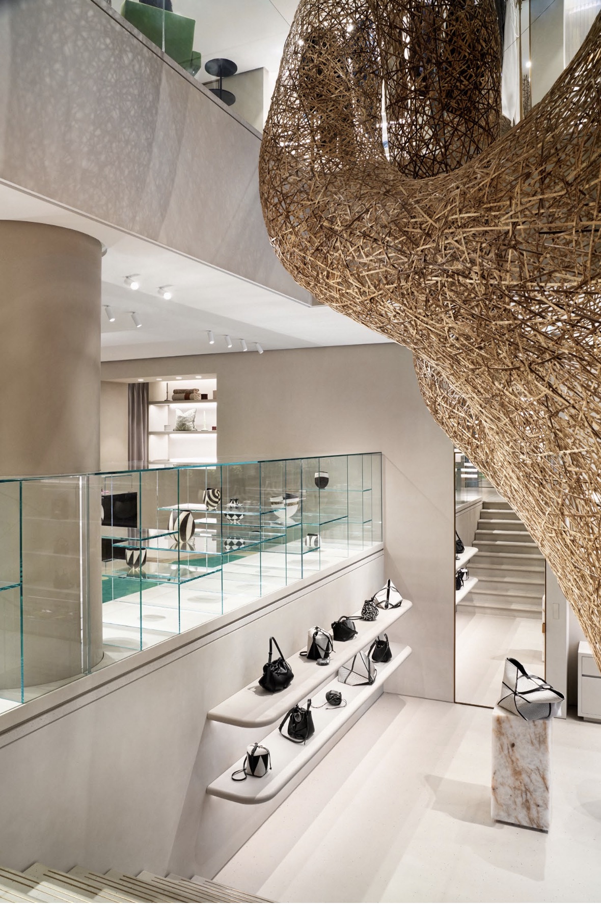 La cuidada selección de muebles incluye las sillas Berin Club con un tapizado a medida en fieltro, las angulares sillas Utrecht y Steltman diseñadas por Gerrit Thomas Rietveld, y las sillas Conoid Cushion de George Nakashima de nogal negro americano y lona. Una serie de característicos bancos puff de LOEWE exponen el sofisticado trabajo en piel de la marca, mientras que las mesas flotantes de terrazo negro, los podios de madera quemada y las vasijas de cerámica antigua añaden dimensiones táctiles.