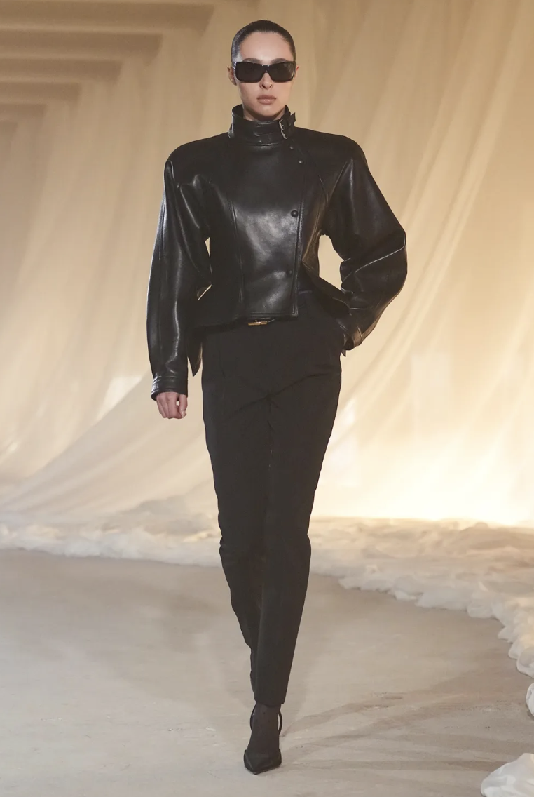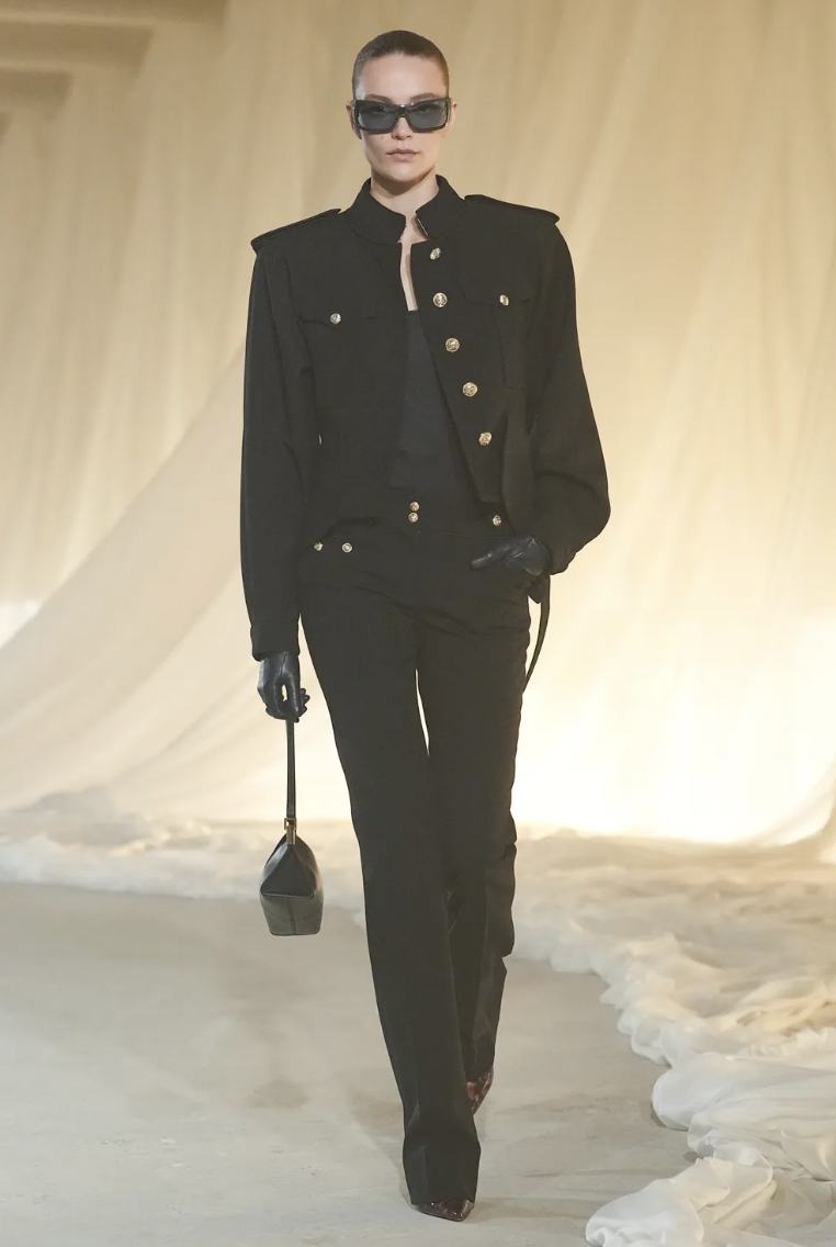 La apertura del desfile destacó por una sastrería impecable que resalta la figura mediante hombreras dramáticas y cinturas extremadamente ceñidas. Este look inicial, confeccionado en tejidos de alta densidad, establece el tono de autoridad que impregna toda la colección Balmain Fall 2026. La precisión en el corte demuestra que la elegancia clásica puede ser profundamente vanguardista cuando se ejecuta con una visión clara.