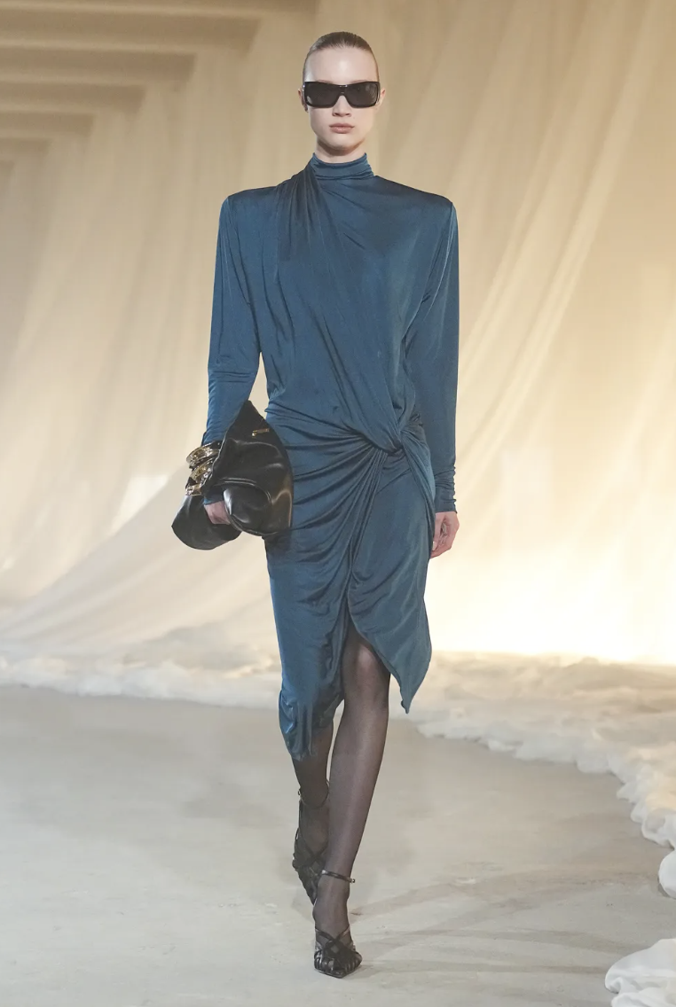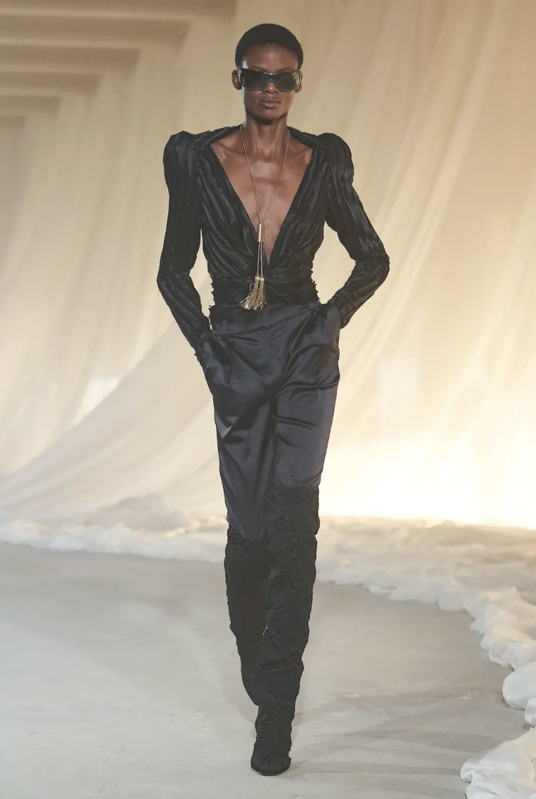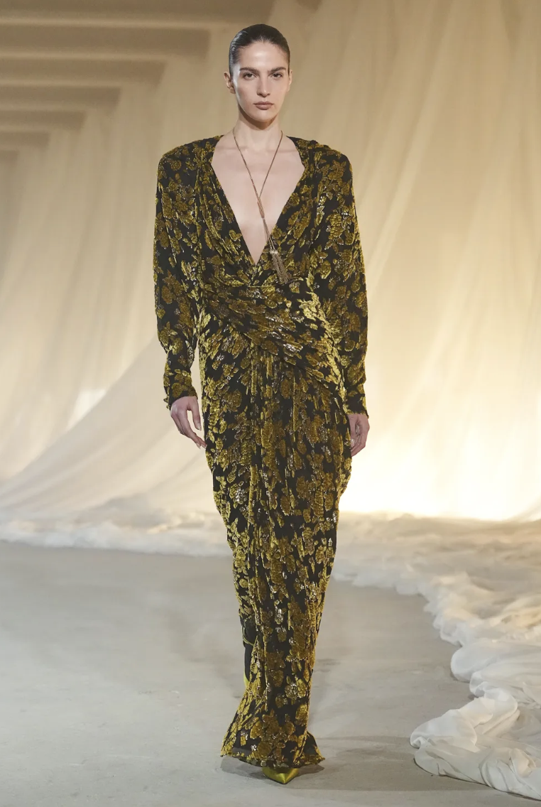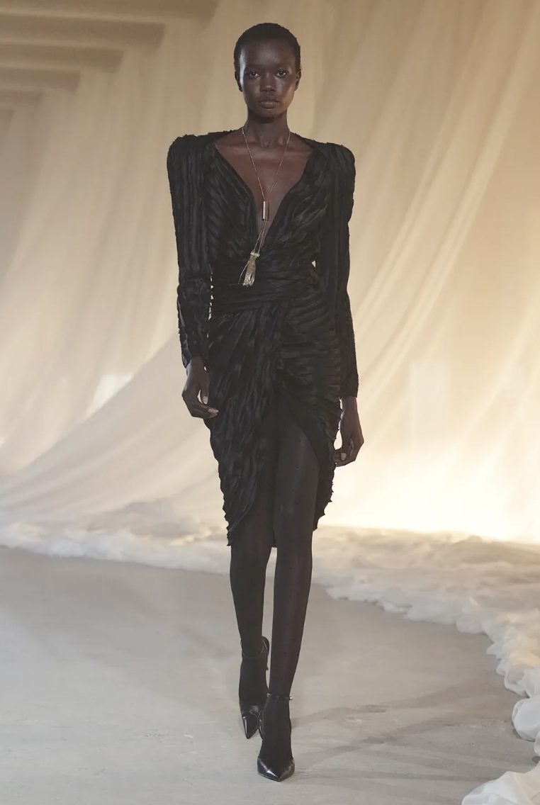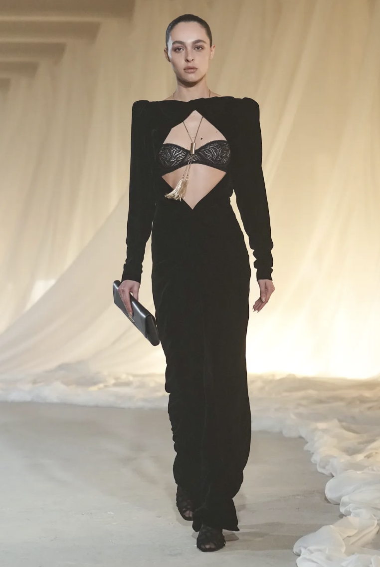 Para equilibrar la rigidez de la sastrería, Rousteing introdujo conjuntos que fluyen con cada paso. Un diseño destacado en terciopelo color chocolate presenta caídas asimétricas que aportan un aire de misterio y sensualidad controlada. Este look ejemplifica la versatilidad de la propuesta otoñal, ofreciendo alternativas que transitan con facilidad del rigor del día a la magia de la noche parisina.