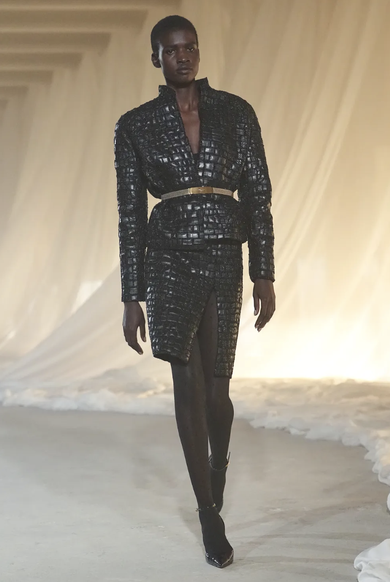 Uno de los momentos más impactantes fue la aparición de vestidos cortos cubiertos por intrincados bordados que evocan la orfebrería francesa. Estas piezas utilizan perlas y cristales para crear patrones geométricos que juegan con la luz de manera hipnótica. Es aquí donde la herencia de Balmain brilla con más fuerza, demostrando que el exceso, cuando se maneja con sofisticación, resulta en una elegancia atemporal y sumamente deseable.