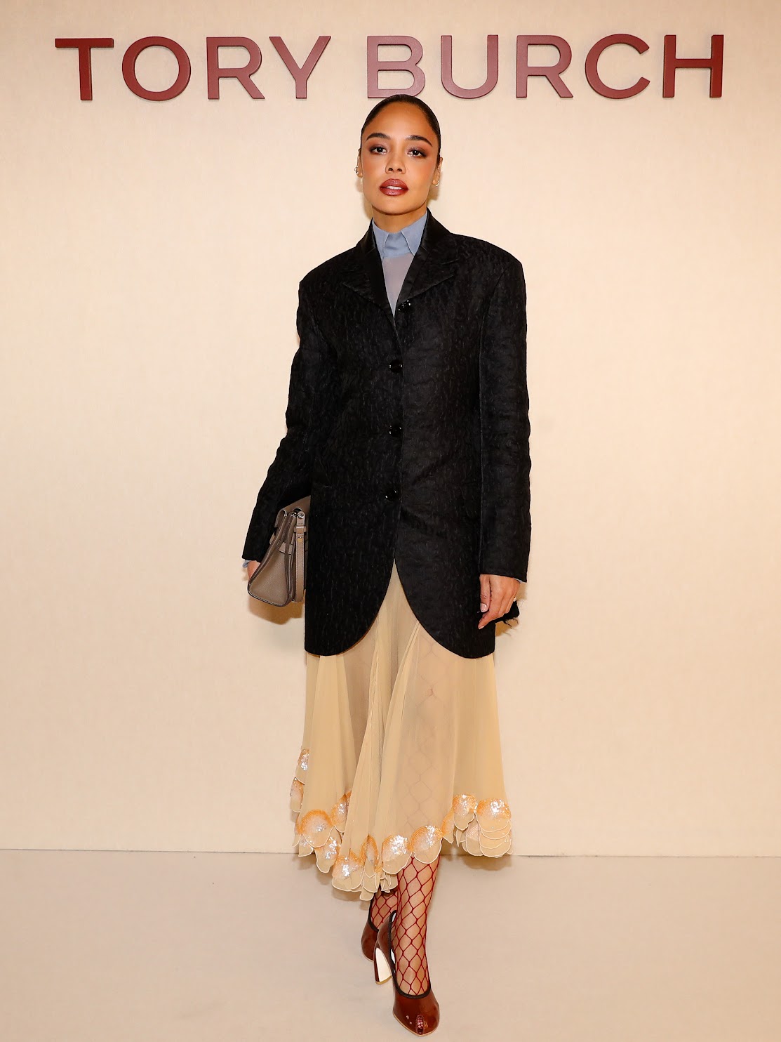 Tessa Thompson lleva el Look 6 de Resort 2026, compuesto por una chaqueta entallada, un polo de cuello alto de seda y una falda acampanada, con zapatos de salón con punta abierta, bolso de mano Lee Radziwill con textura granulada y anillo apilable Miller con pavé.