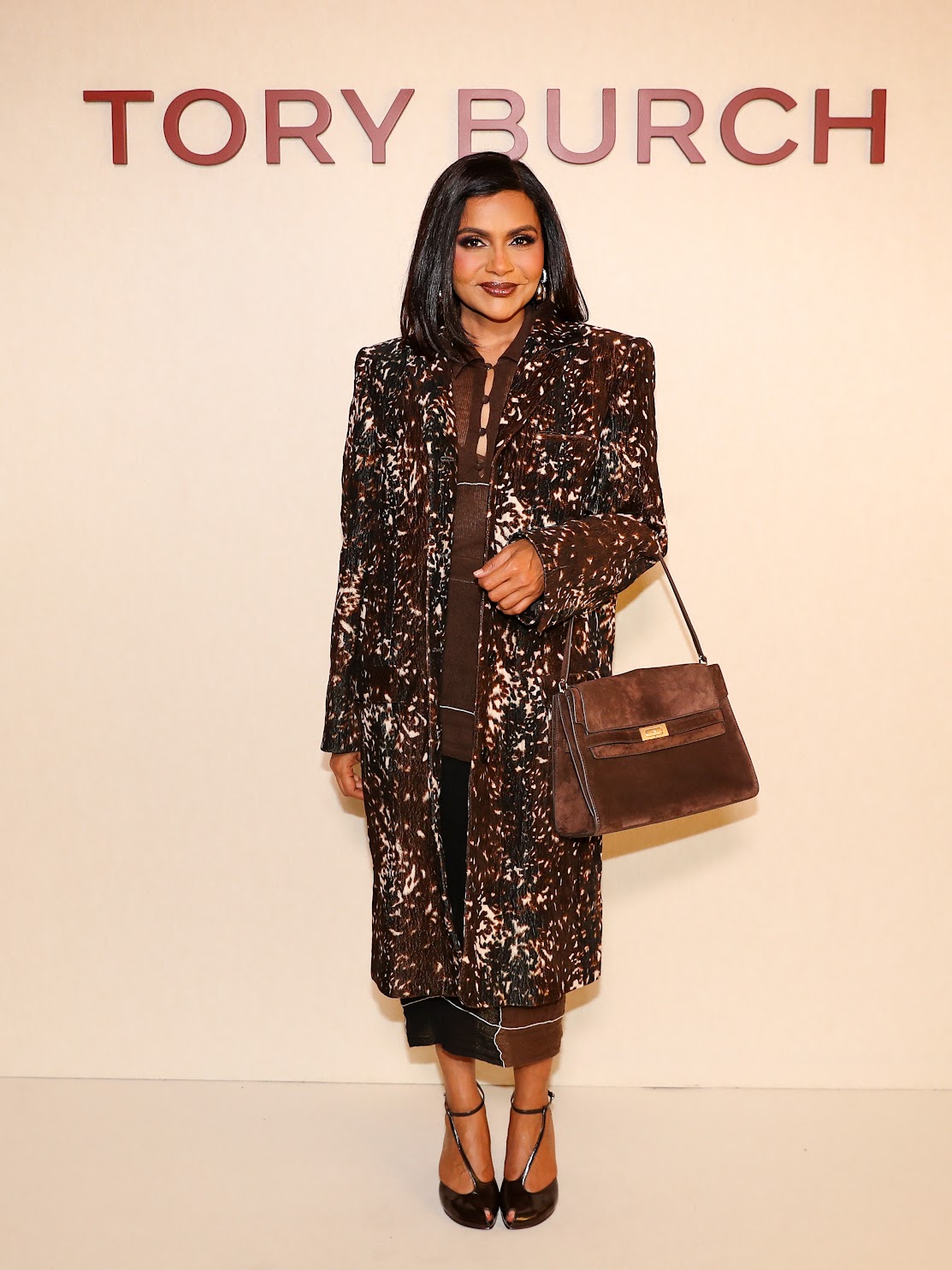 Mindy Kaling lleva el abrigo de terciopelo texturizado Look 13 de la colección Otoño/Invierno 2025 y un top y una falda de punto de lana, con zapatos de salón con punta abierta y correa en T, bolso de hombro grande de ante Lee Radziwill, pendientes de aro ondulados y gafas de sol cuadradas oversize con montura perforada.