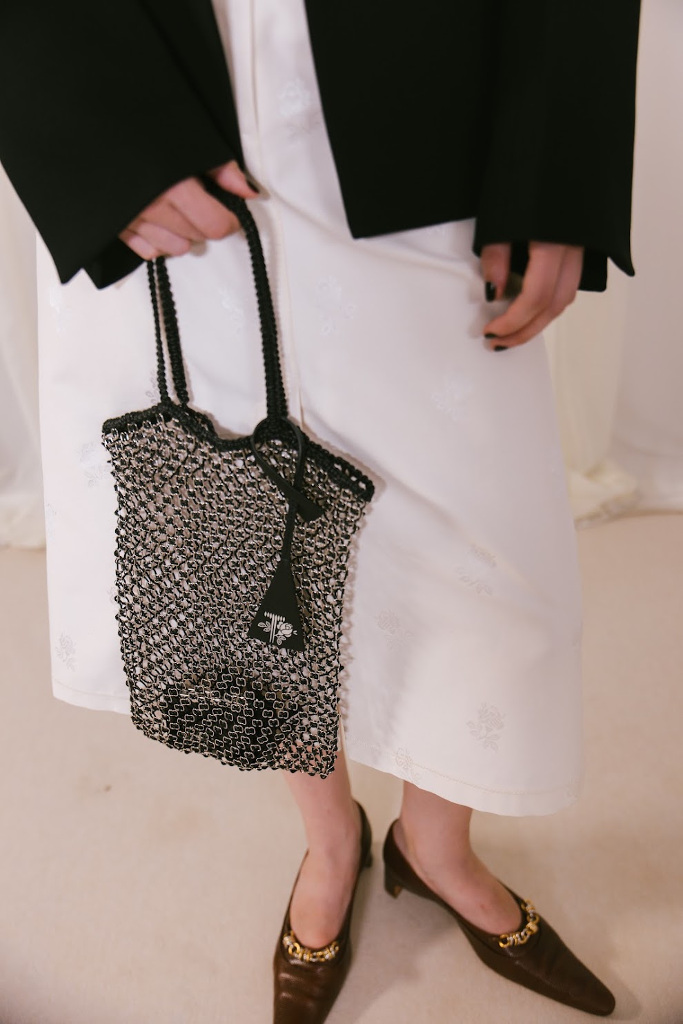 Mientras que en los bolsos, el clásico bolso Lee Radziwill, diseñado originalmente en 2018, se reduce y aligera y algunas versiones cuentan con asas de metal o cuentas. El bolso bombonera Romy regresa en cuero envejecido, mientras que las mallas de cadena y los bolsos de crochet ofrecen una energía informal y desenfadada.