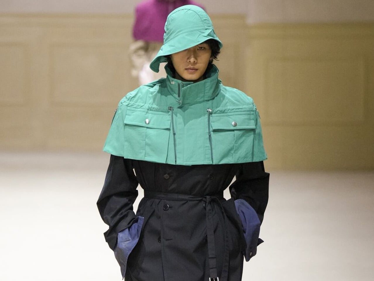 Entre los artículos destacados de la pasarela se encontraba una capa modular para hombre que se ajustaba sobre abrigos y chamarras, ofreciendo una capa de protección y utilidad. Las camisas de vestir para hombre tenían cuellos de camiseta y se abrochan en la espalda; puños exageradamente largos y desgastados a propósito sobresalen de las mangas de las chamarras.