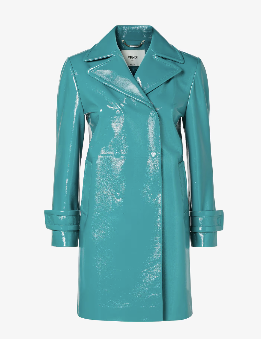Gabardina de largo medio y corte recto, con manga tres cuartos con alamares en los puños y piel suave turquesa con acabado brillante. Su precio es de 6.500 euros en la web de la marca.