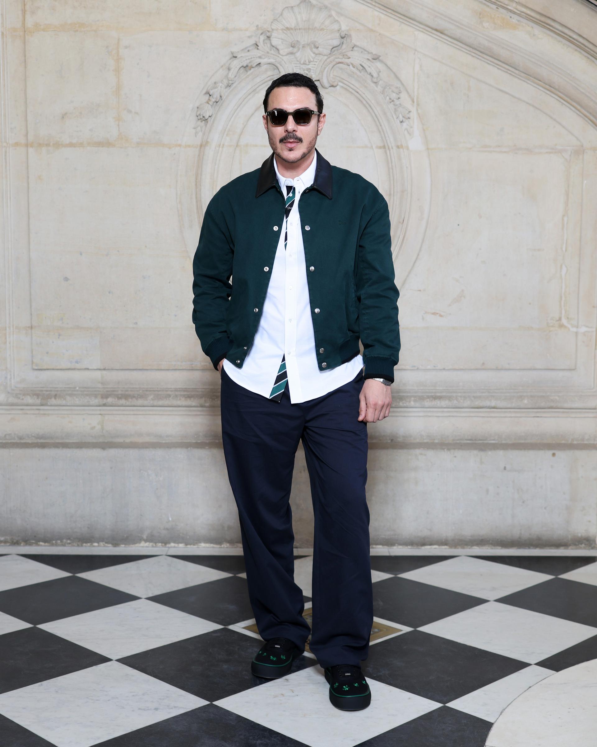 Bassel Khaiat lució una chaqueta bomber de algodón verde de Dior, una camisa de algodón blanca y pantalones de lana azul marino. También lució accesorios de Dior.