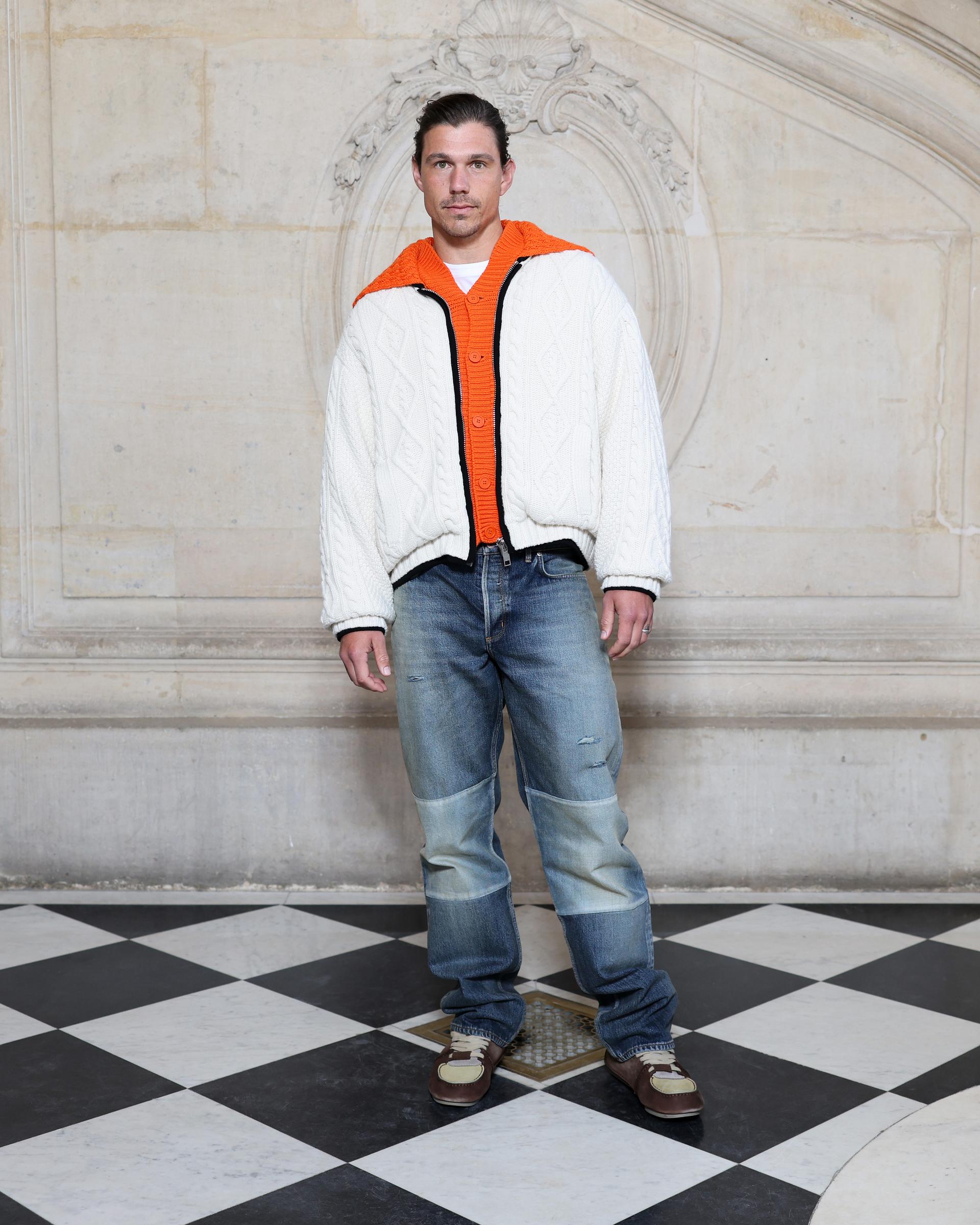 Ben Smith Petersen lució una cazadora de lana blanca y naranja de Dior, una camiseta blanca de algodón y vaqueros azules. También lució accesorios de Dior.