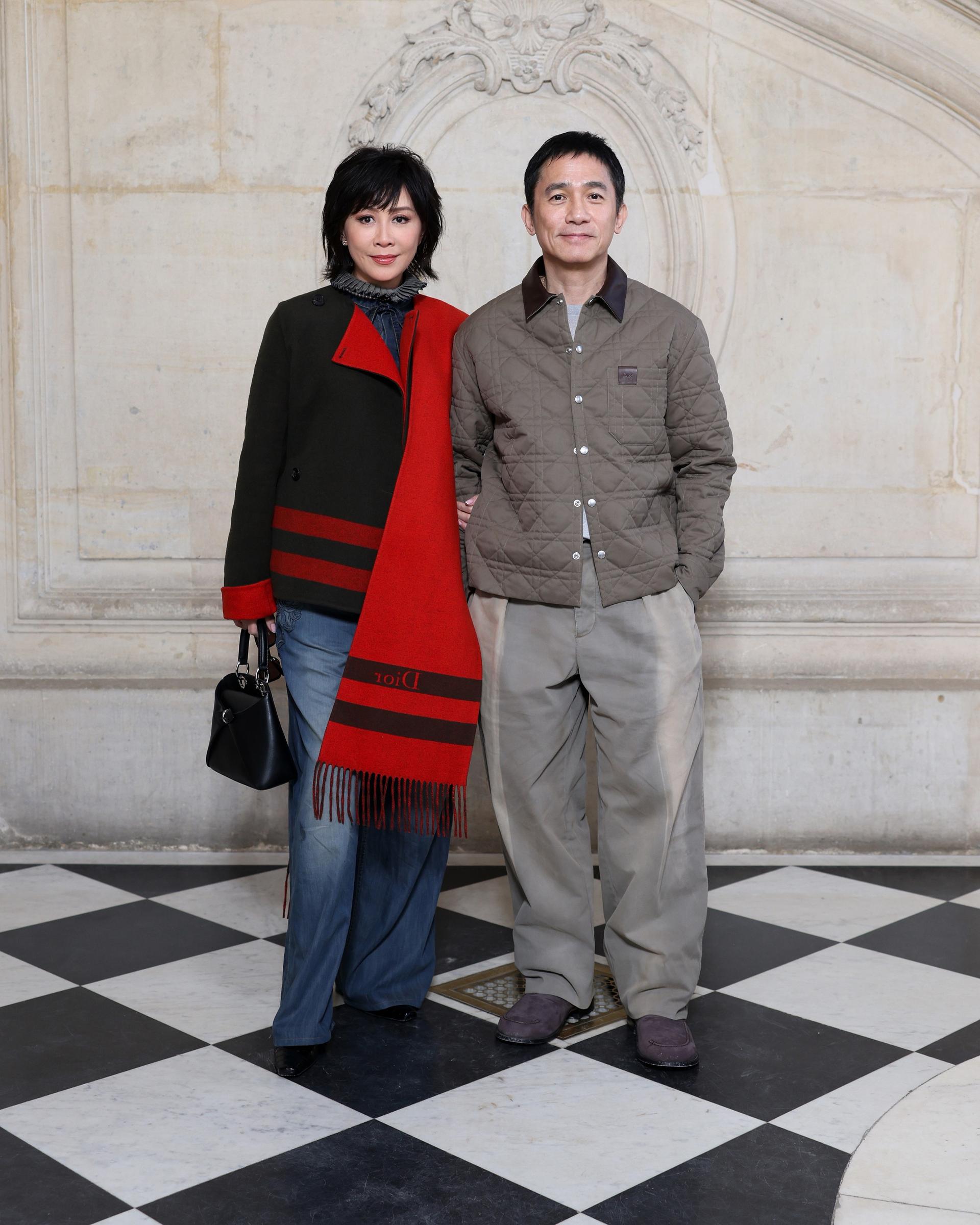 Tony Leung lució una chaqueta de algodón marrón de Dior, una camiseta de algodón gris y pantalones de lana marrón. También lució accesorios de Dior.