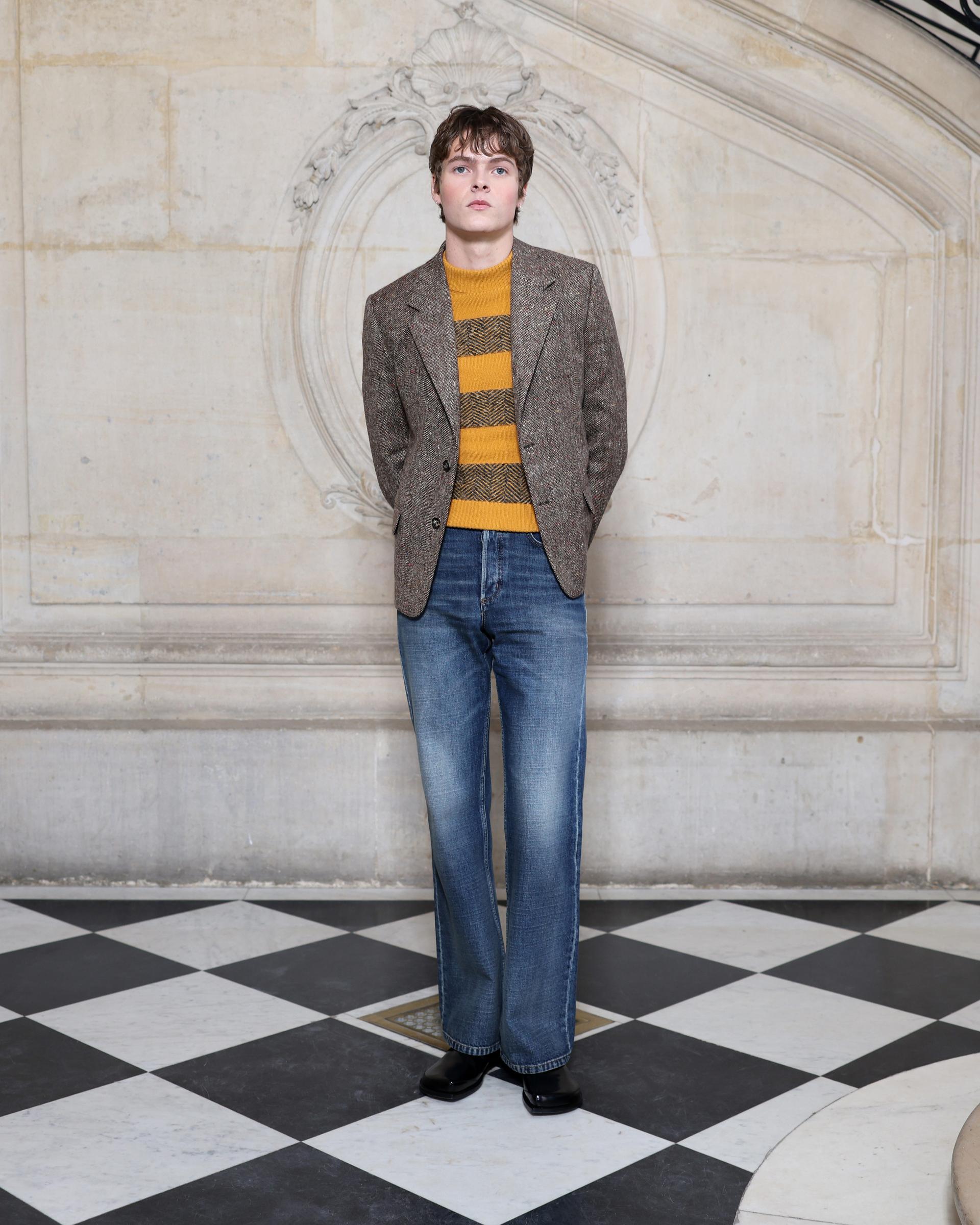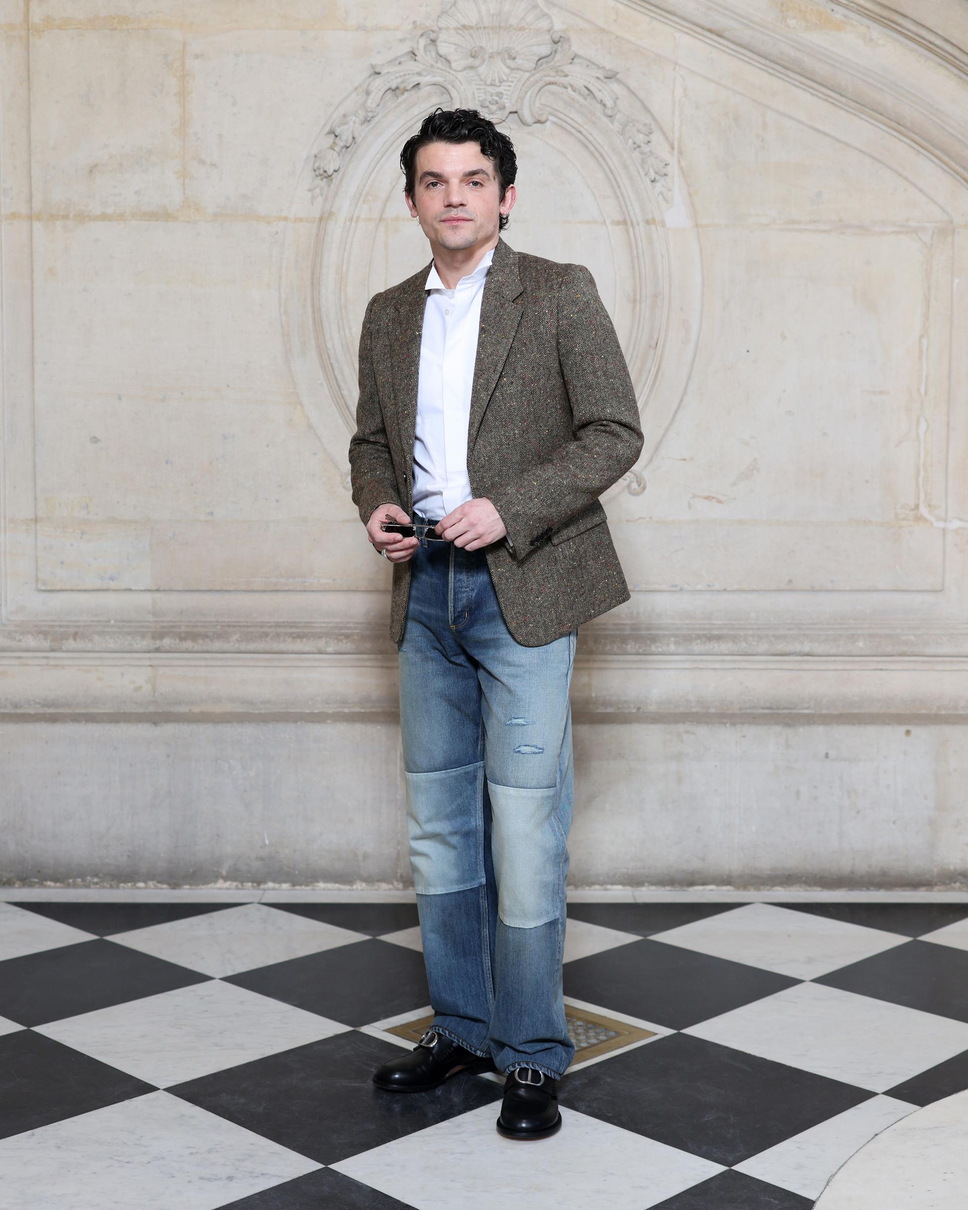 Edward Bluemel lució una chaqueta Dior de lana marrón con solapa de muesca, una camisa blanca de algodón y vaqueros azules. También lució accesorios Dior.