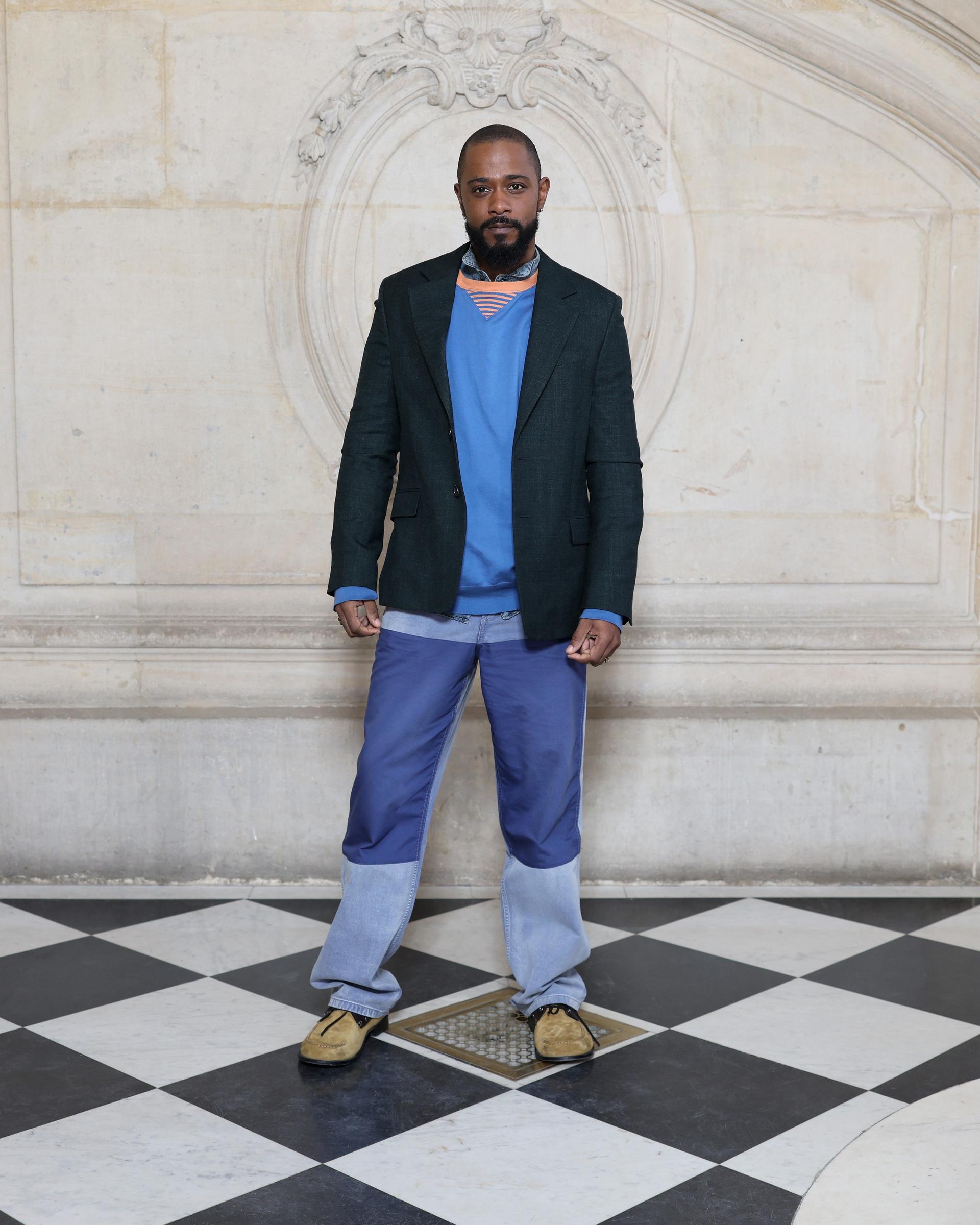 Lakeith Stanfield lució una chaqueta de lana gris oscuro con solapa de muesca de Dior, un jersey azul y pantalones azules de algodón. También lució accesorios de Dior.