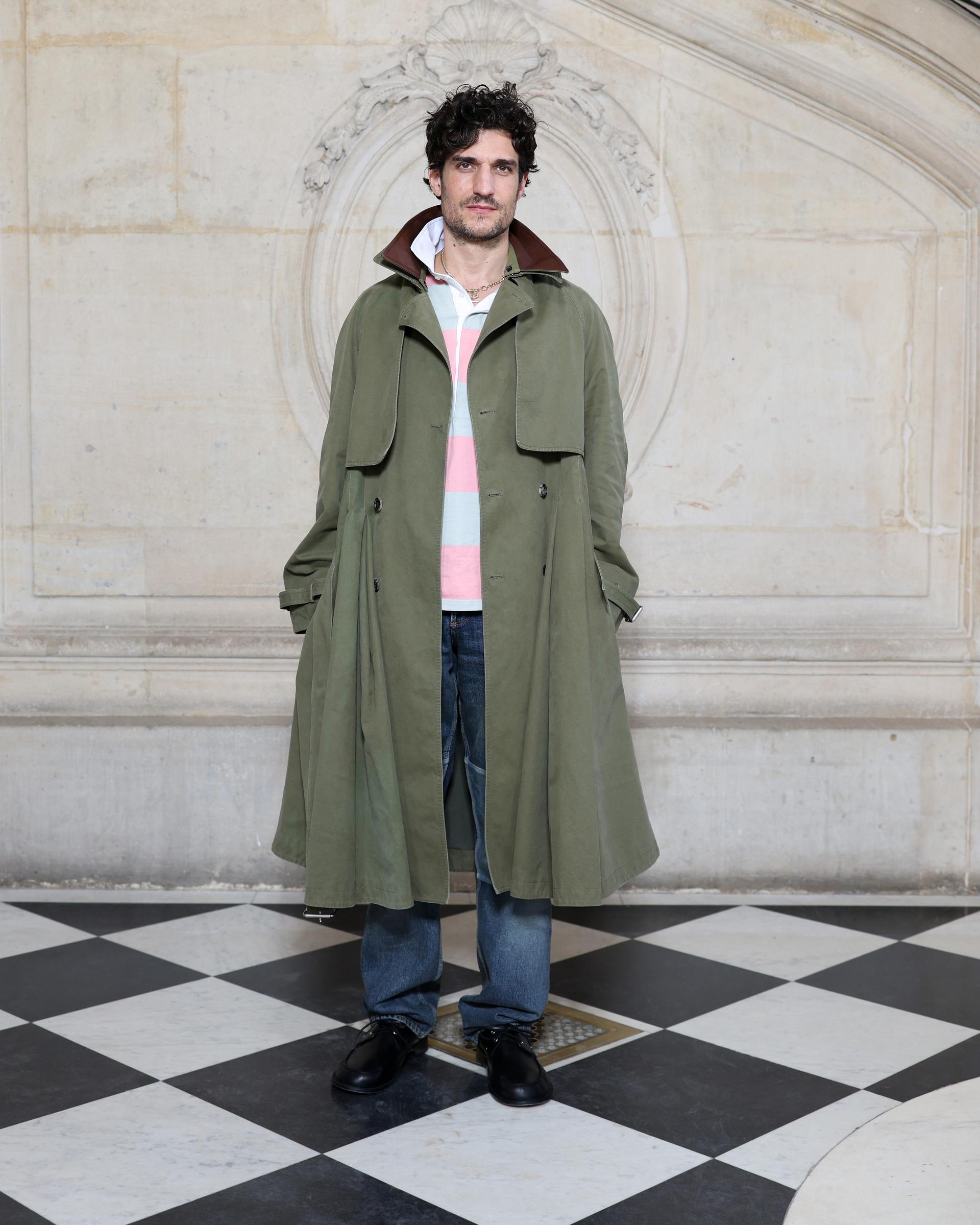 Louis Garrel lució una gabardina plisada de algodón caqui de Dior, un polo de punto gris y rosa y vaqueros azules. También lució accesorios de Dior.