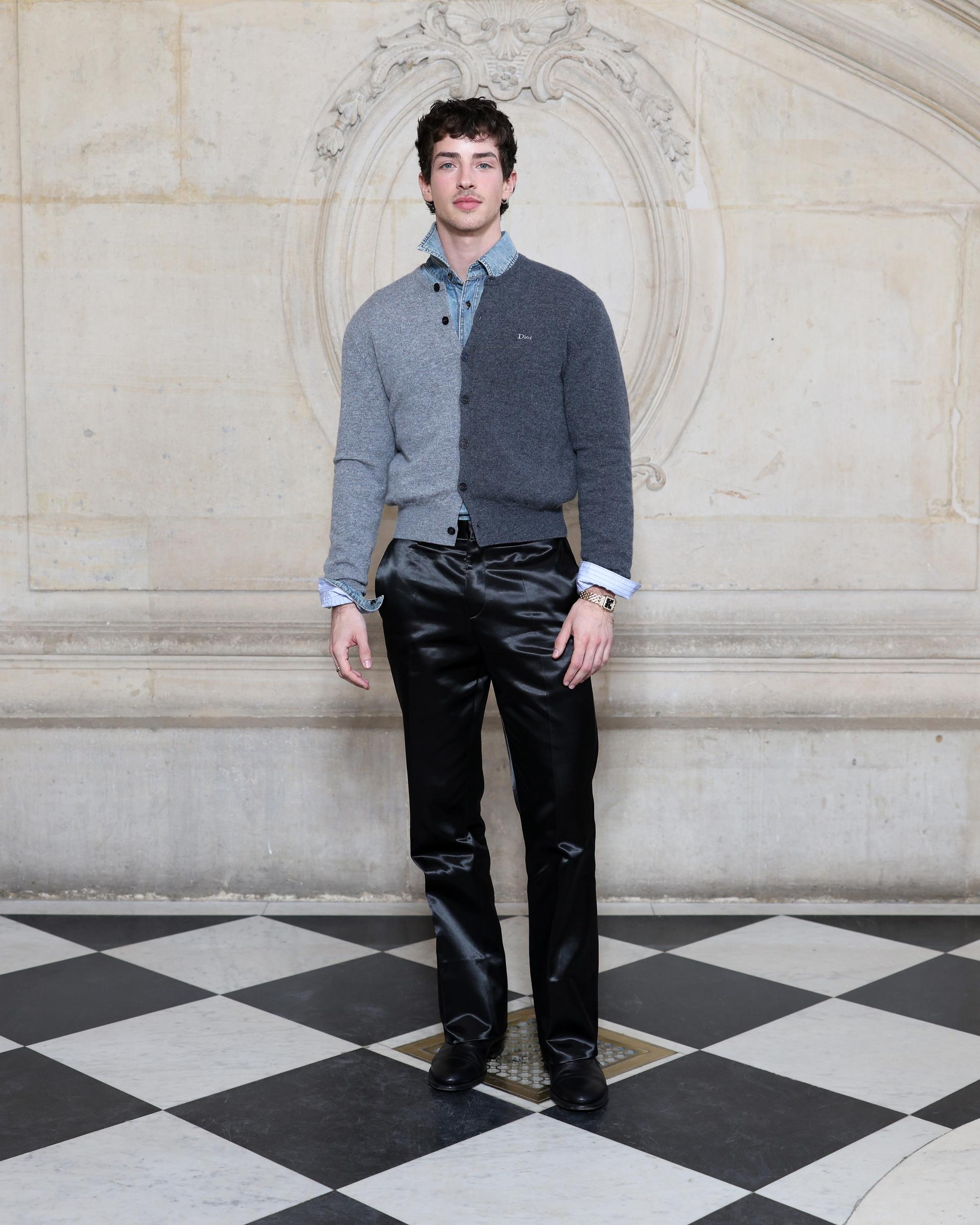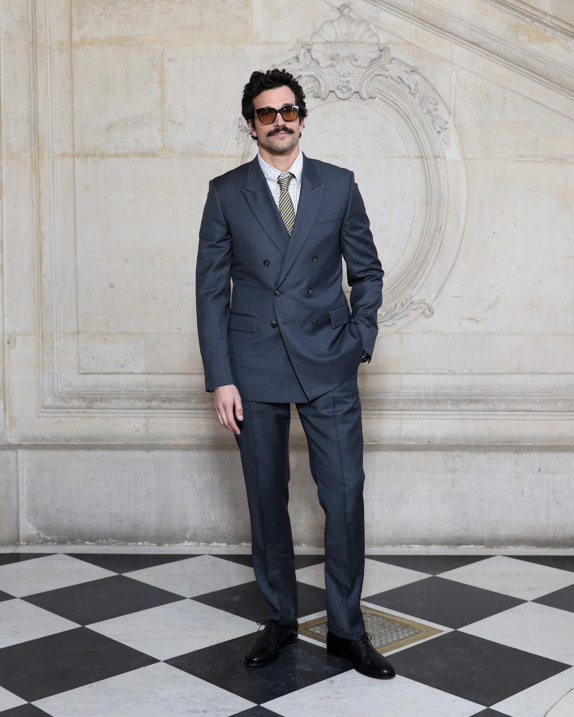 Paul Anthony Kelly lució un traje gris Dior cruzado con solapa de pico y una camisa blanca de algodón a cuadros. También lució accesorios Dior.