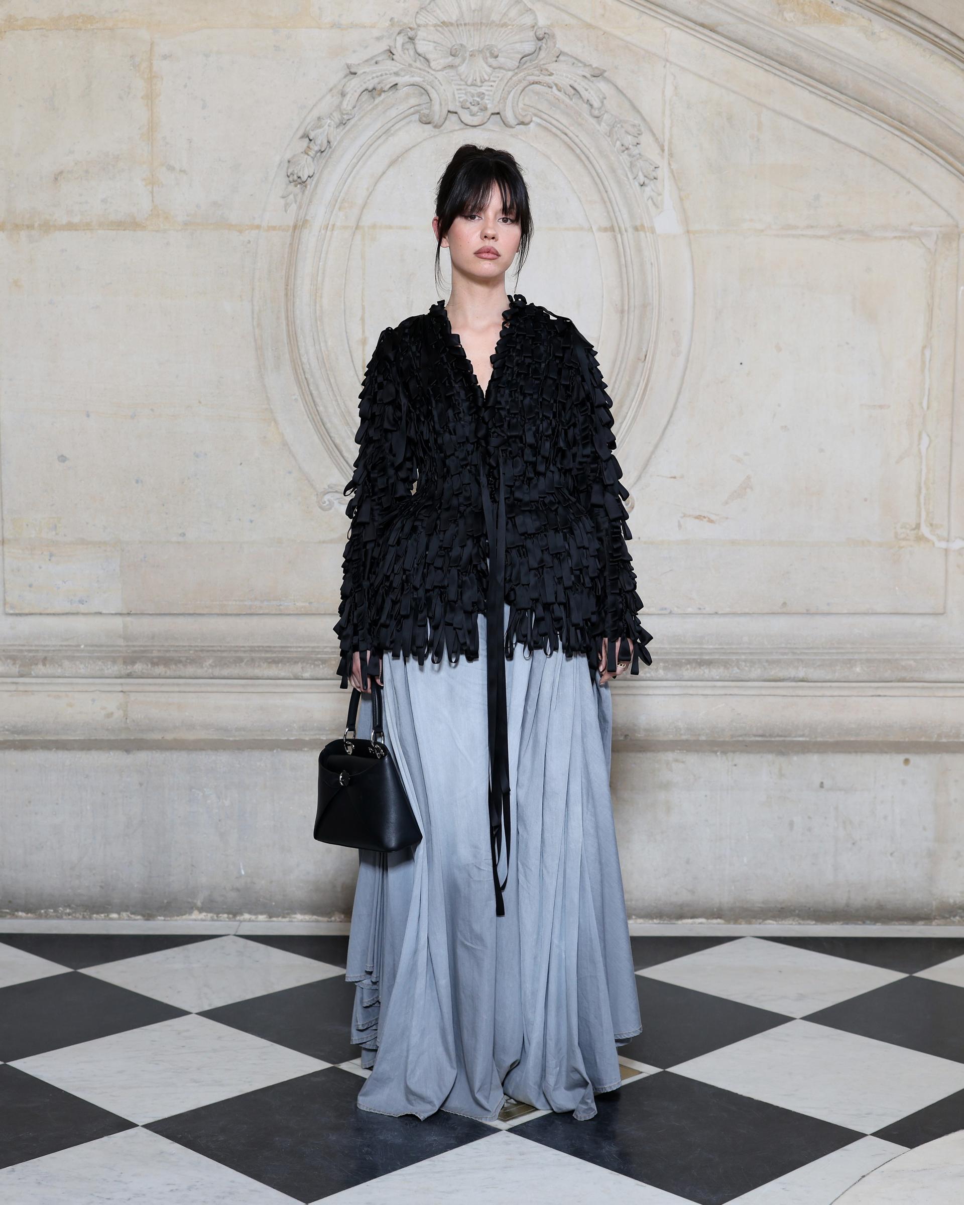 Mia Goth lució una chaqueta de lana negra de Dior con pantalones de seda gris. También lució accesorios de Dior.
