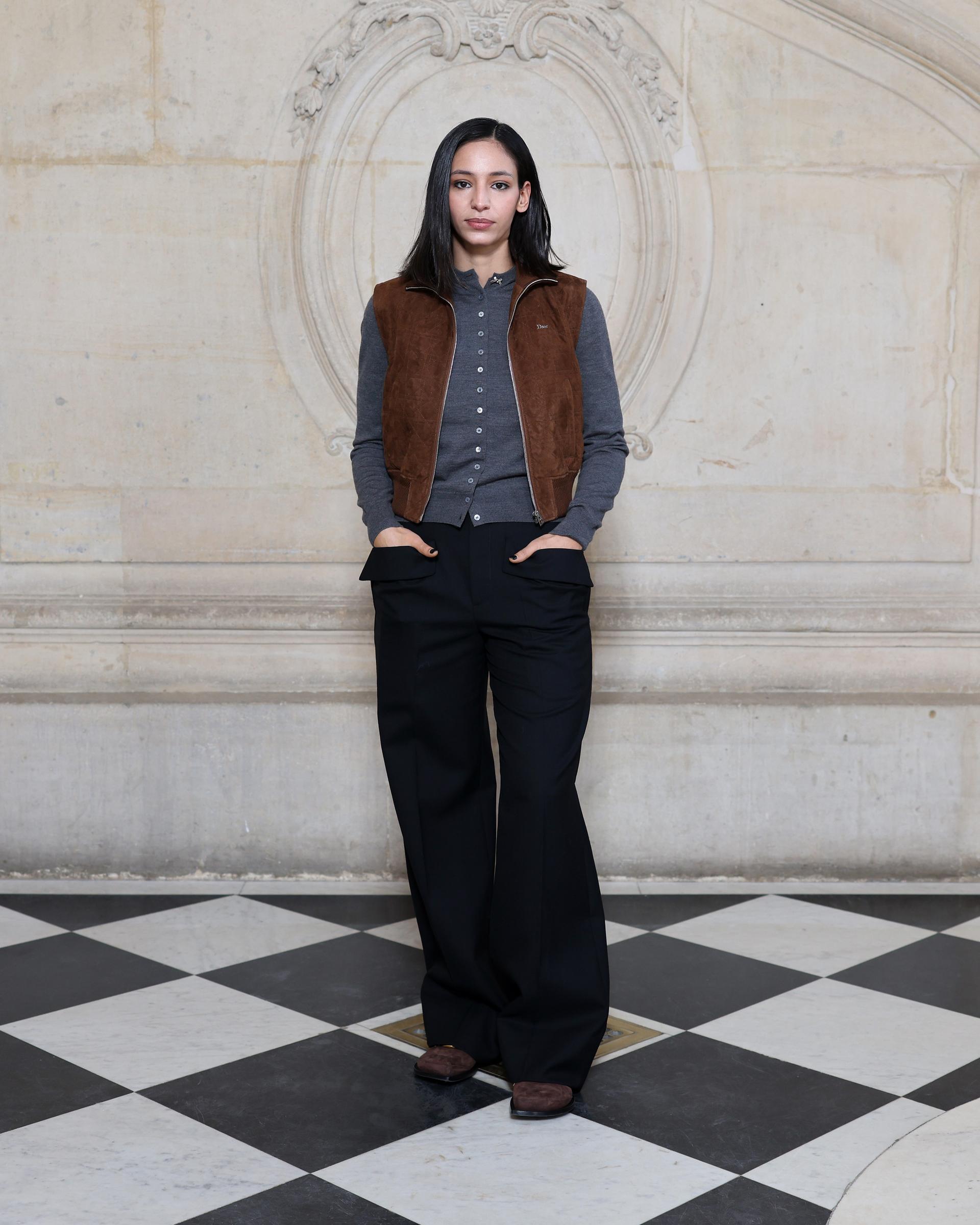 Nadia Melliti lució una chaqueta sin mangas de cuero marrón de Dior sobre una camisa de algodón azul y pantalones negros de crepé de seda. También lució accesorios de Dior.