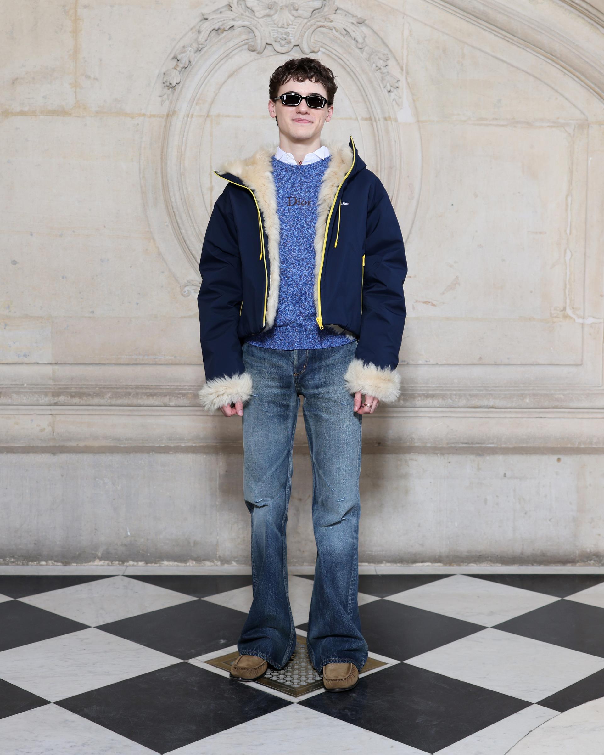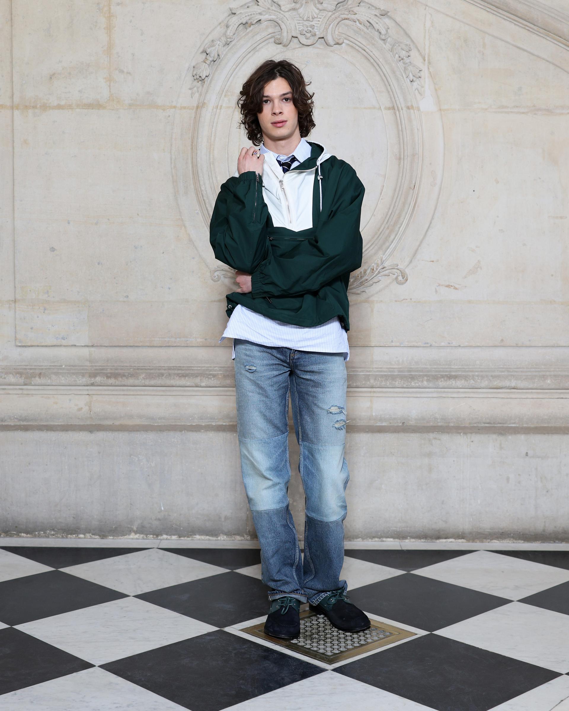 Paul Kircher lució un impermeable verde de Dior, una camisa de algodón a rayas azules y vaqueros azules. También lució accesorios de Dior.