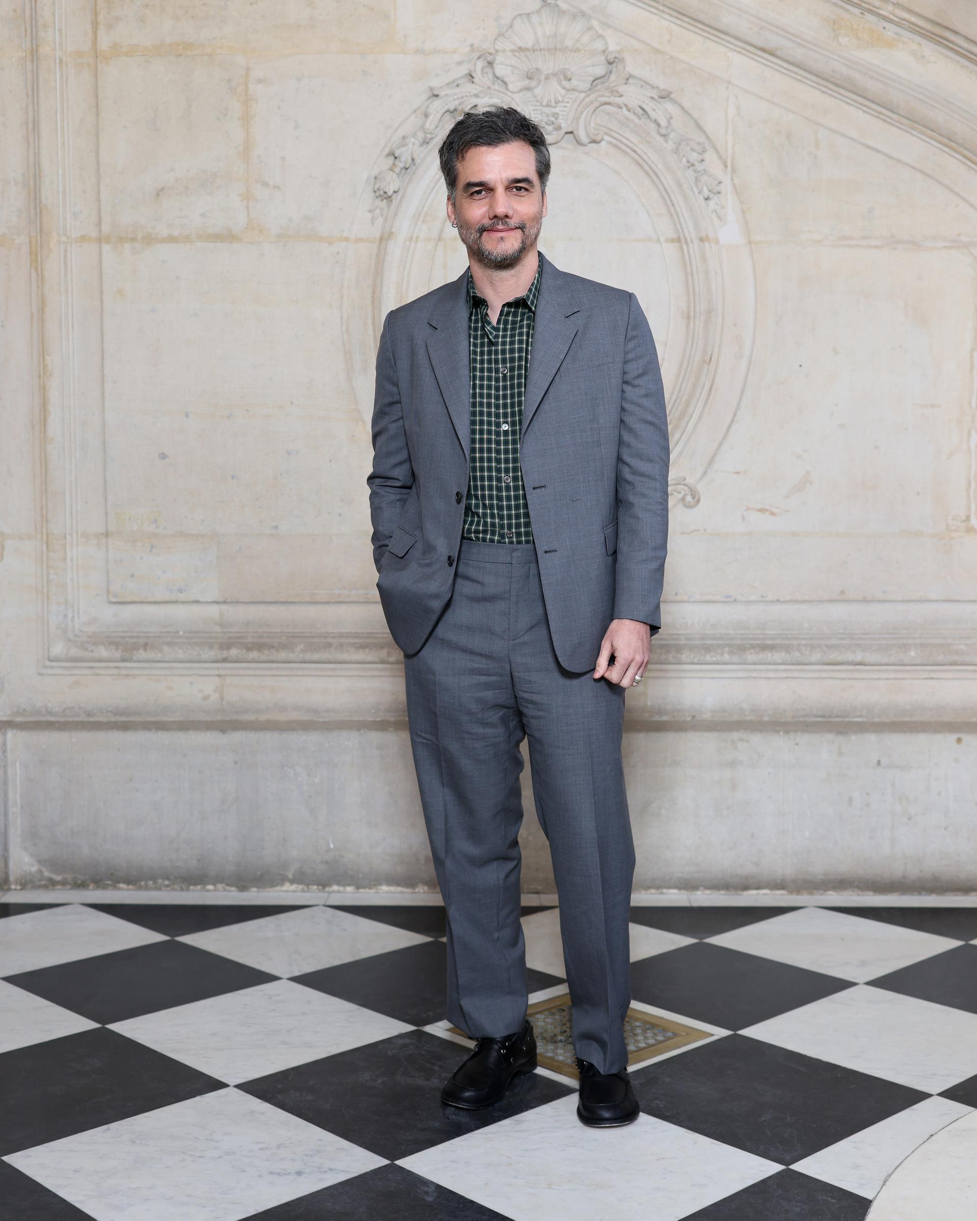 Wagner Moura lució un traje de lana gris de Dior con solapa de muesca y una camisa verde a cuadros. También lució accesorios de Dior.