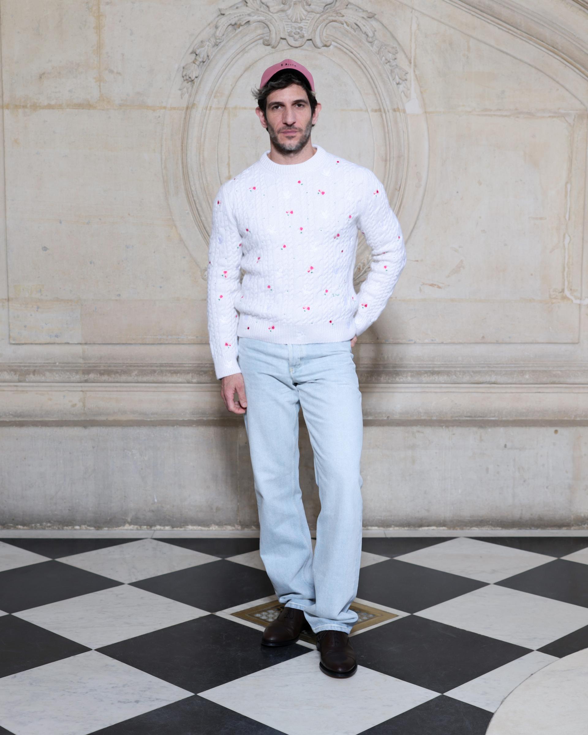 Quim Gutierrez wore a Dior white cashmere embroidered crewneck and light blue denim jeans. He also wore Dior accessories.
