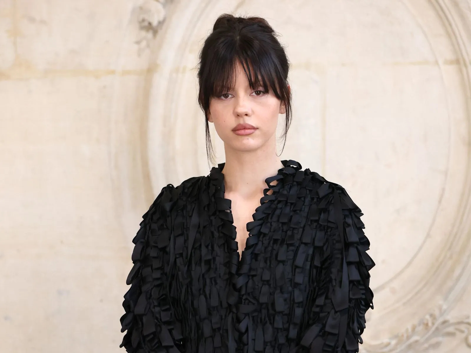 Mia Goth lució una chaqueta de lana negra de Dior con pantalones de seda gris. También lució accesorios de Dior.