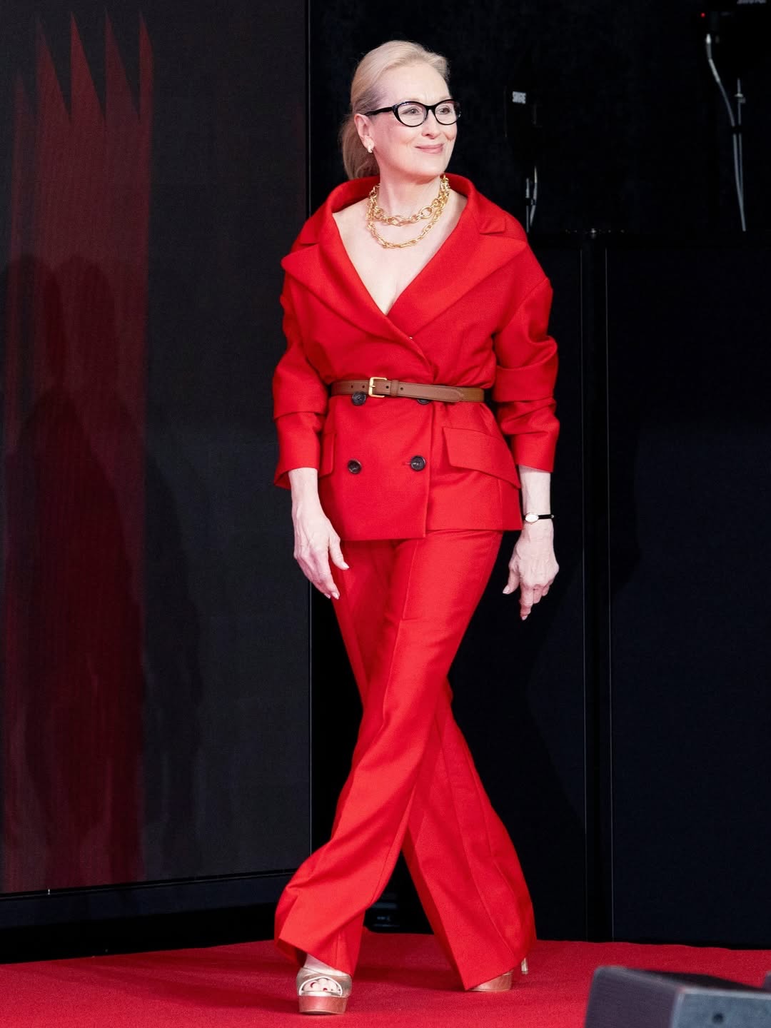 En uno de sus looks más clásicos, Meryl Streep llevó un traje rojo de Prada con tailoring impecable, estilizado con un cinturón café, demostrando cómo se lleva un traje rojo con tacones dorados.