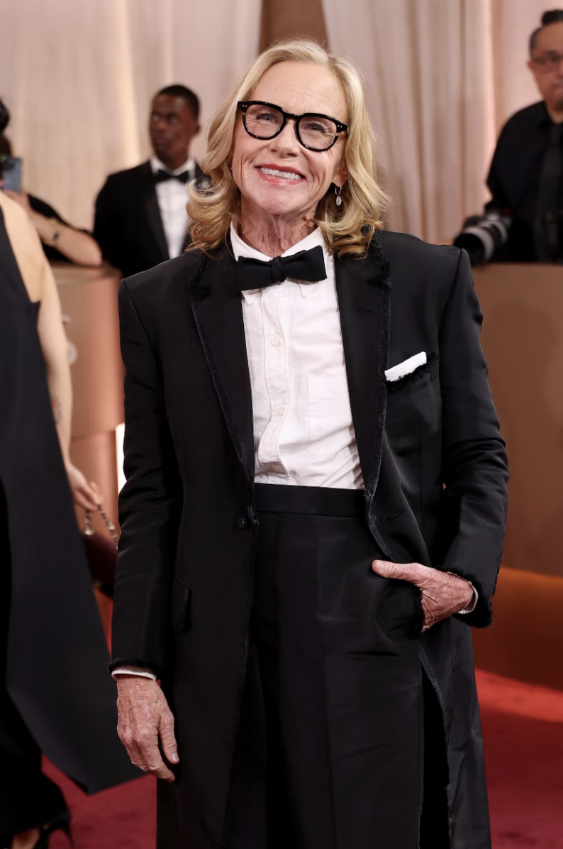 La destacada actriz optó por la distinción clásica. Su maquillaje fue suave, utilizando tonos arena y un labial en coral apagado. Su peinado corto con ondas suaves aportó volumen y marco a su rostro.