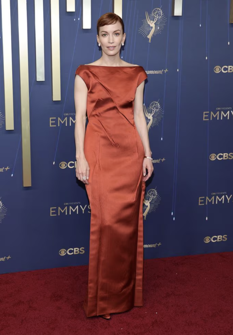 Con un vestido color ladrillo, Britt demuestra que la sobriedad también puede ser inolvidable.