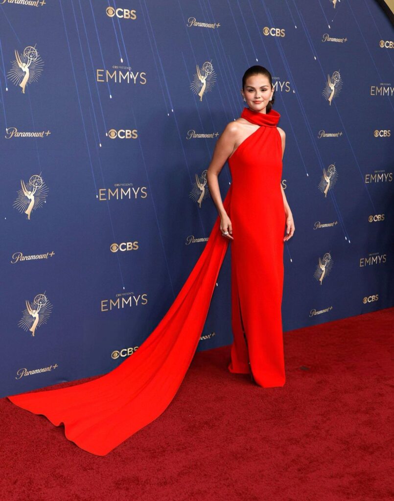 Selena brilla con fuerza en un vestido largo rojo de cuello alto y escote asimétrico. Joyería plata minimalista para dejar que el vestido hable por sí solo.