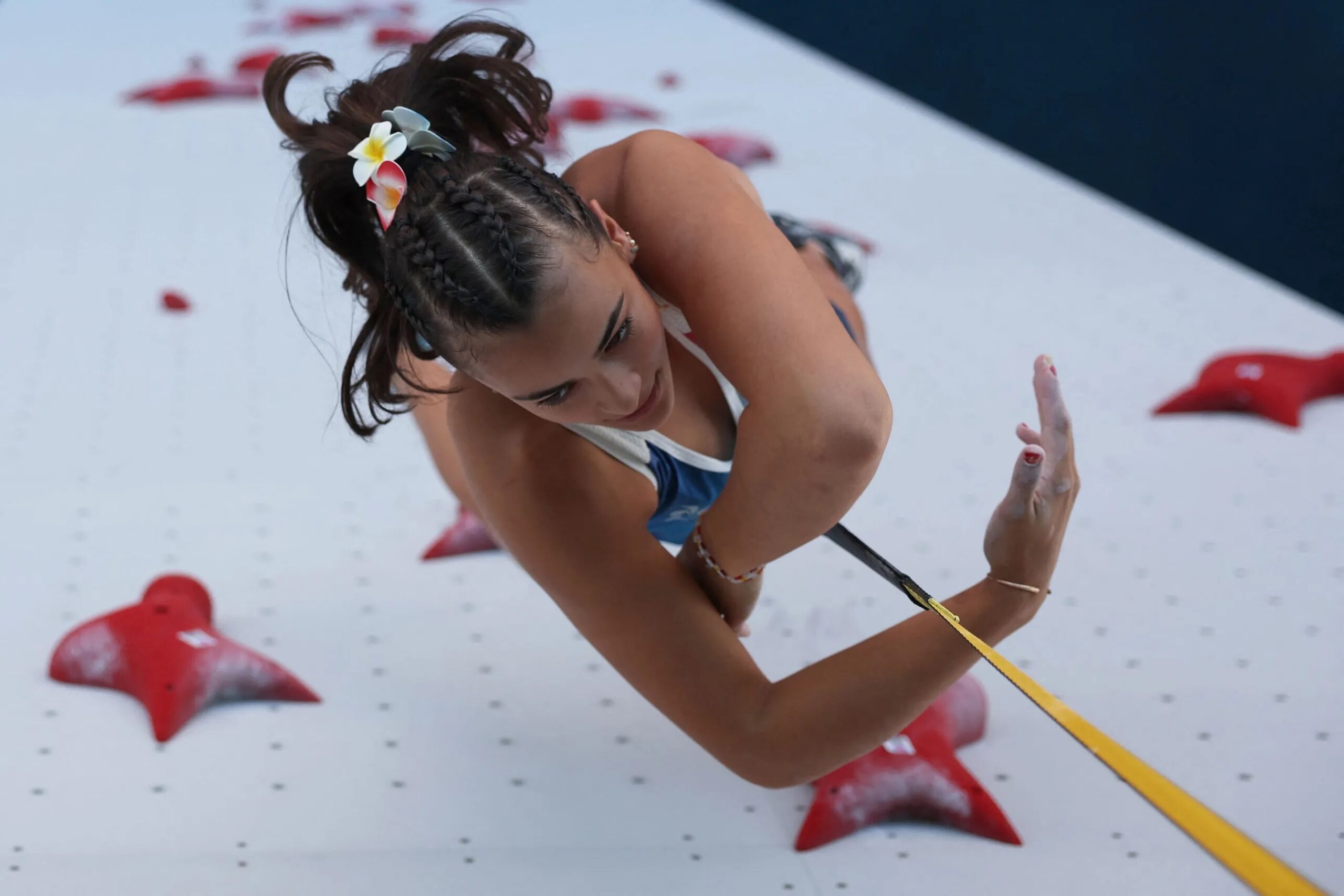 La escaladora apostó por las trenzas rematadas en una coleta con flores en el pelo.