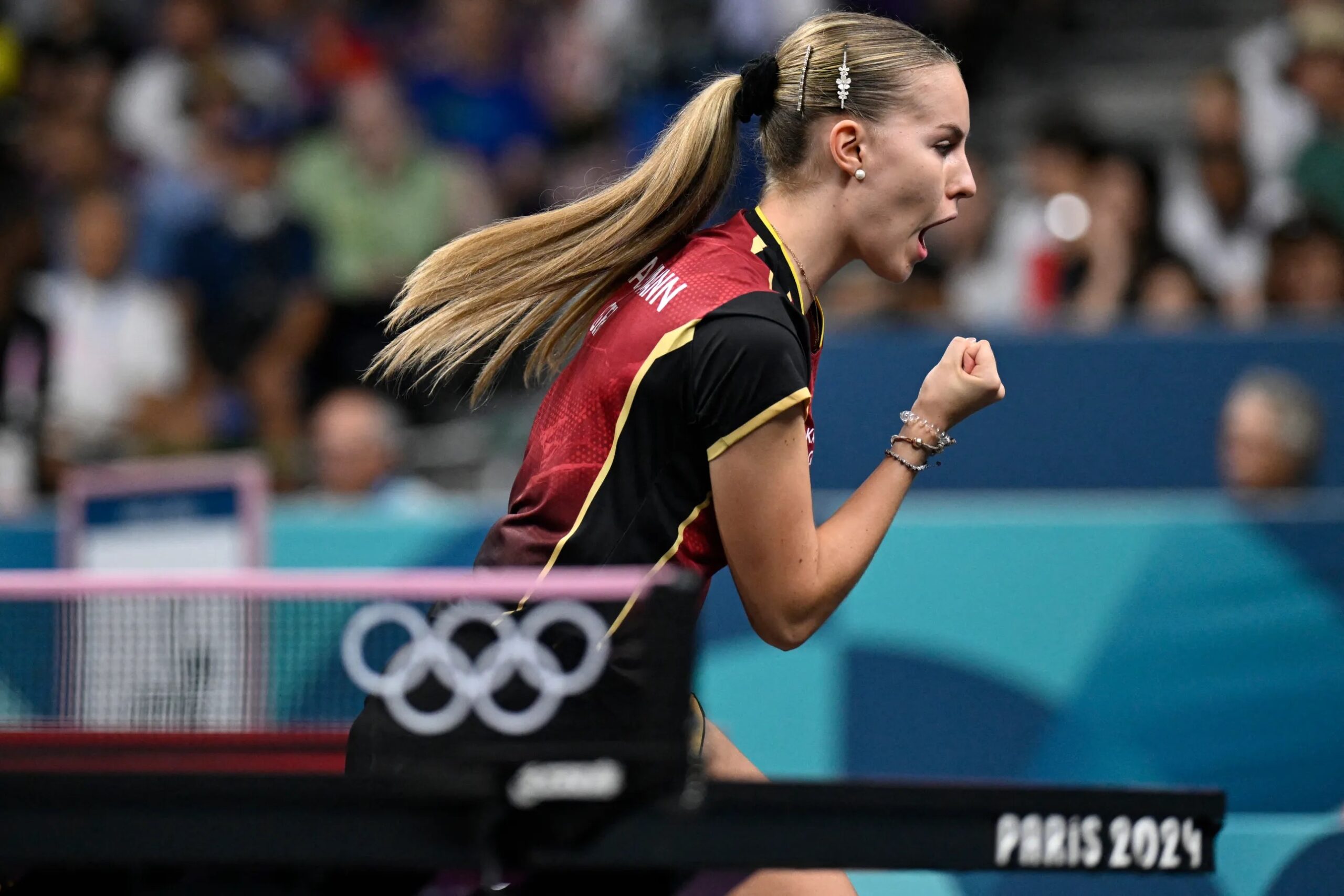 La tenista de mesa lució un recogido con coleta largay baja, que adornó con diferentes pasadores joya en los lados, elevando el look.
