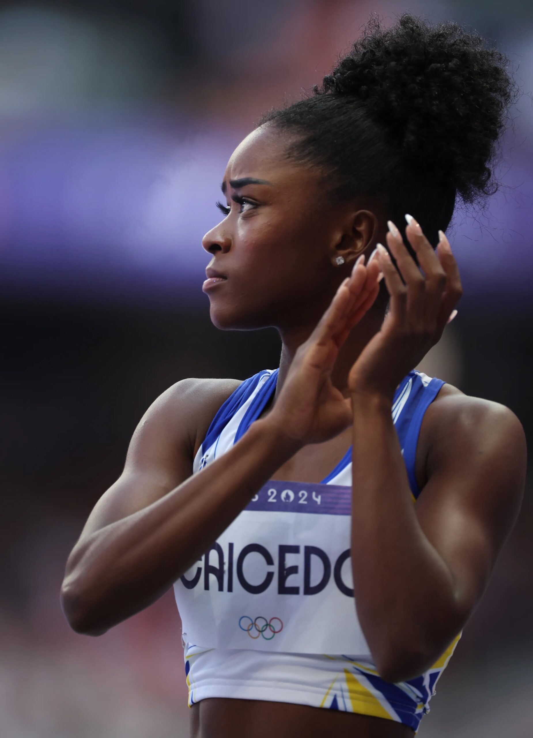 La corredora ecuatoriana de 400 metros lisos apostó por un recogido alto y muy tirante, que dejaba muy marcado su pelo afro.