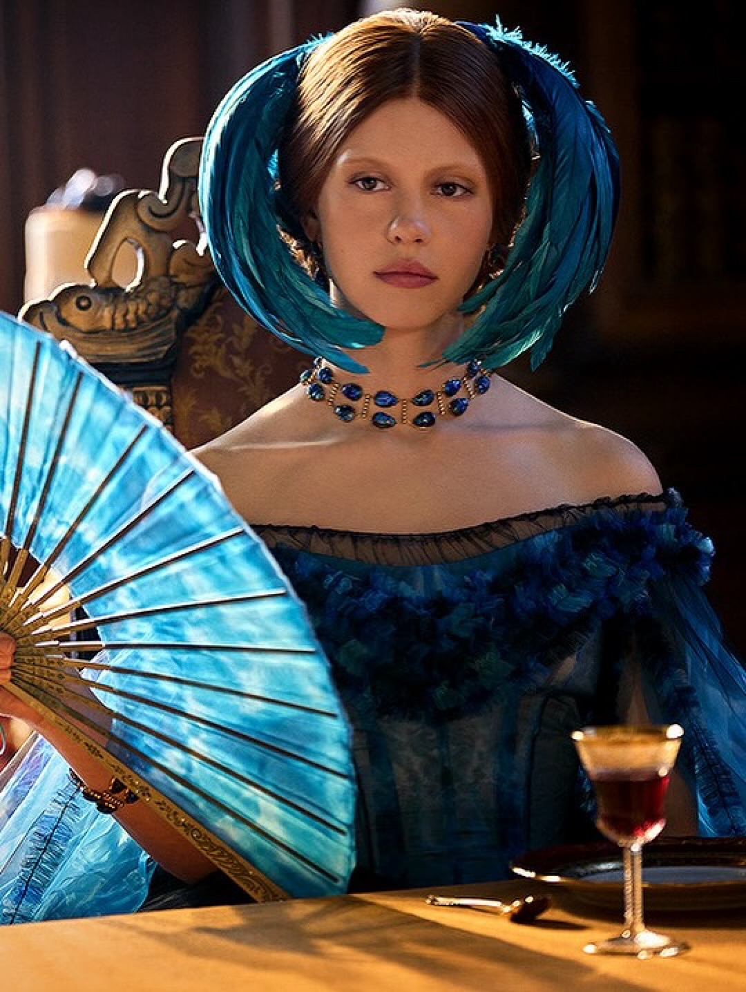 Por otro lado, cuando Mia Goth encarna a Elizabeth Lavenza, su vestuario en tonos azules sugiere tanto devoción como distancia, ya que se manifiesta como símbolo de espiritualidad, de apertura, pero también de inaccesibilidad. Viktor no mira únicamente un cuerpo, sino la idea de vida que ella representa.