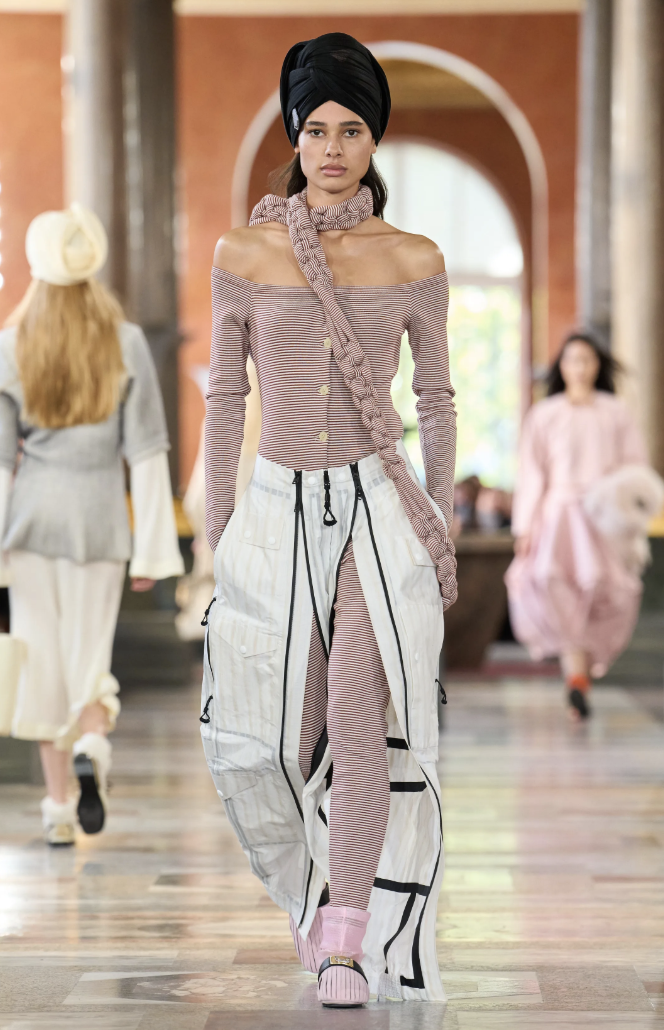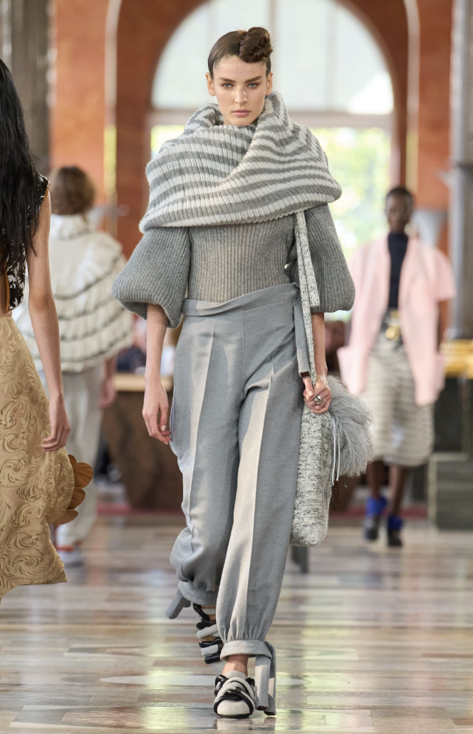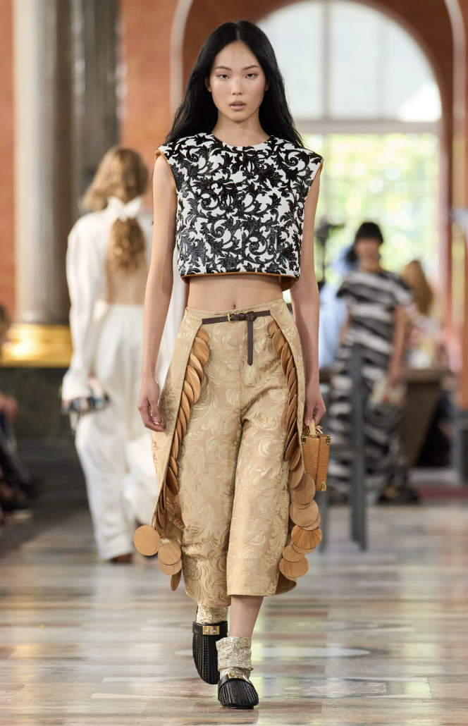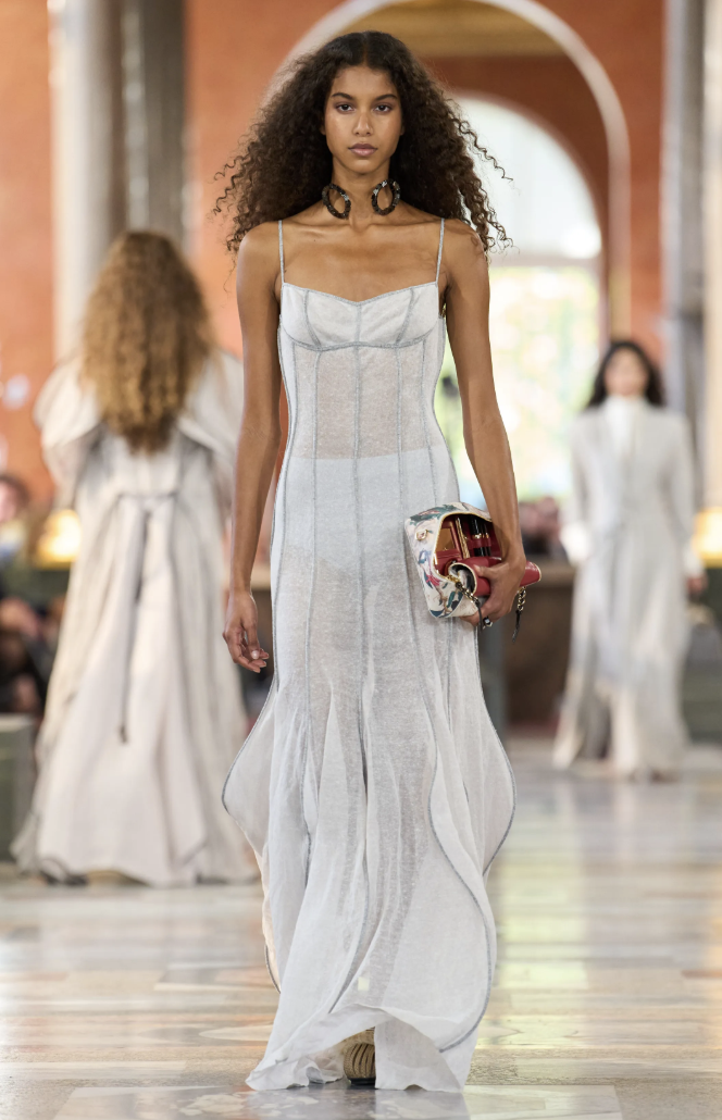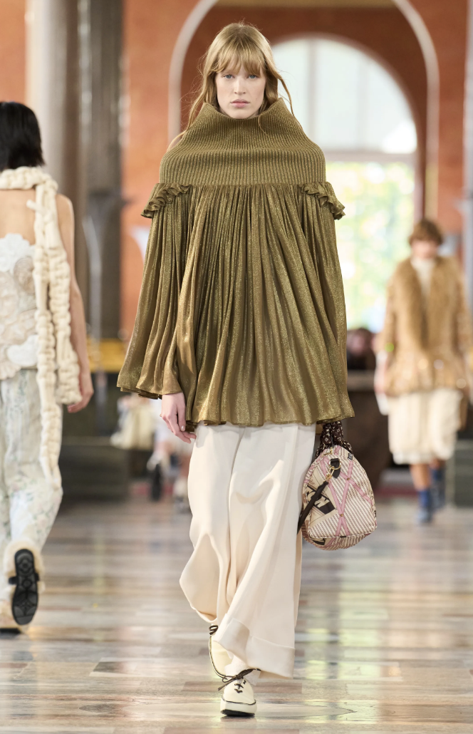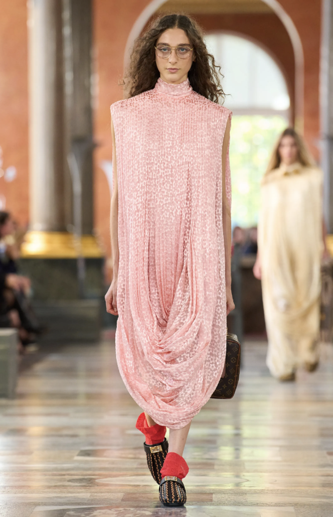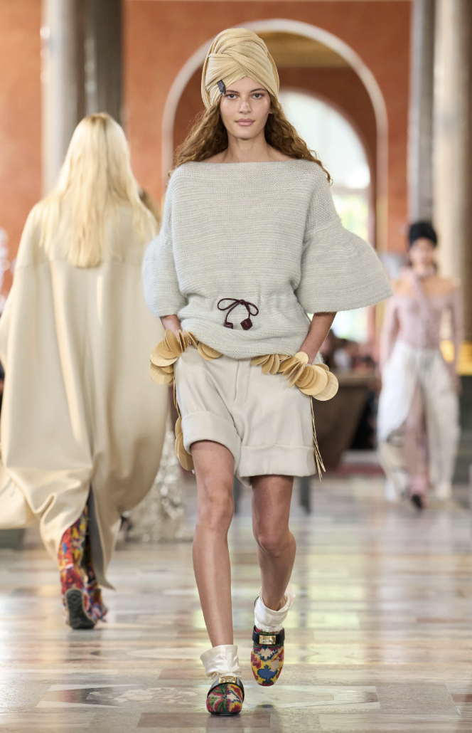 Los accesorios, entre ellos los clásicos bolsos Speedy y las coloridas pochettes, acompañaron con naturalidad a las siluetas libres que desfilaban con túnicas inspiradas en turbantes. La sensación de ligereza fue tan importante como la propuesta estética.