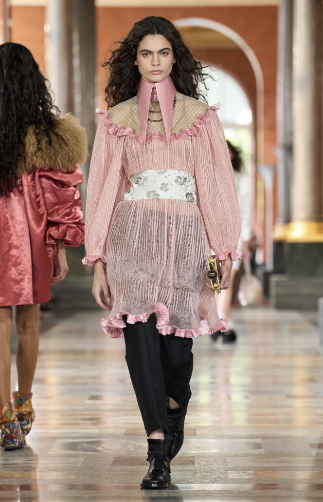 Nicolas Ghesquière, director creativo desde 2013, eligió los antiguos apartamentos de la reina Ana de Austria en el Louvre para desplegar una colección marcada por la feminidad suave y las reminiscencias de los años sesenta. El ambiente estuvo acompañado por una banda sonora de jazz con narración de Cate Blanchett, que añadió un aire poético al conjunto.