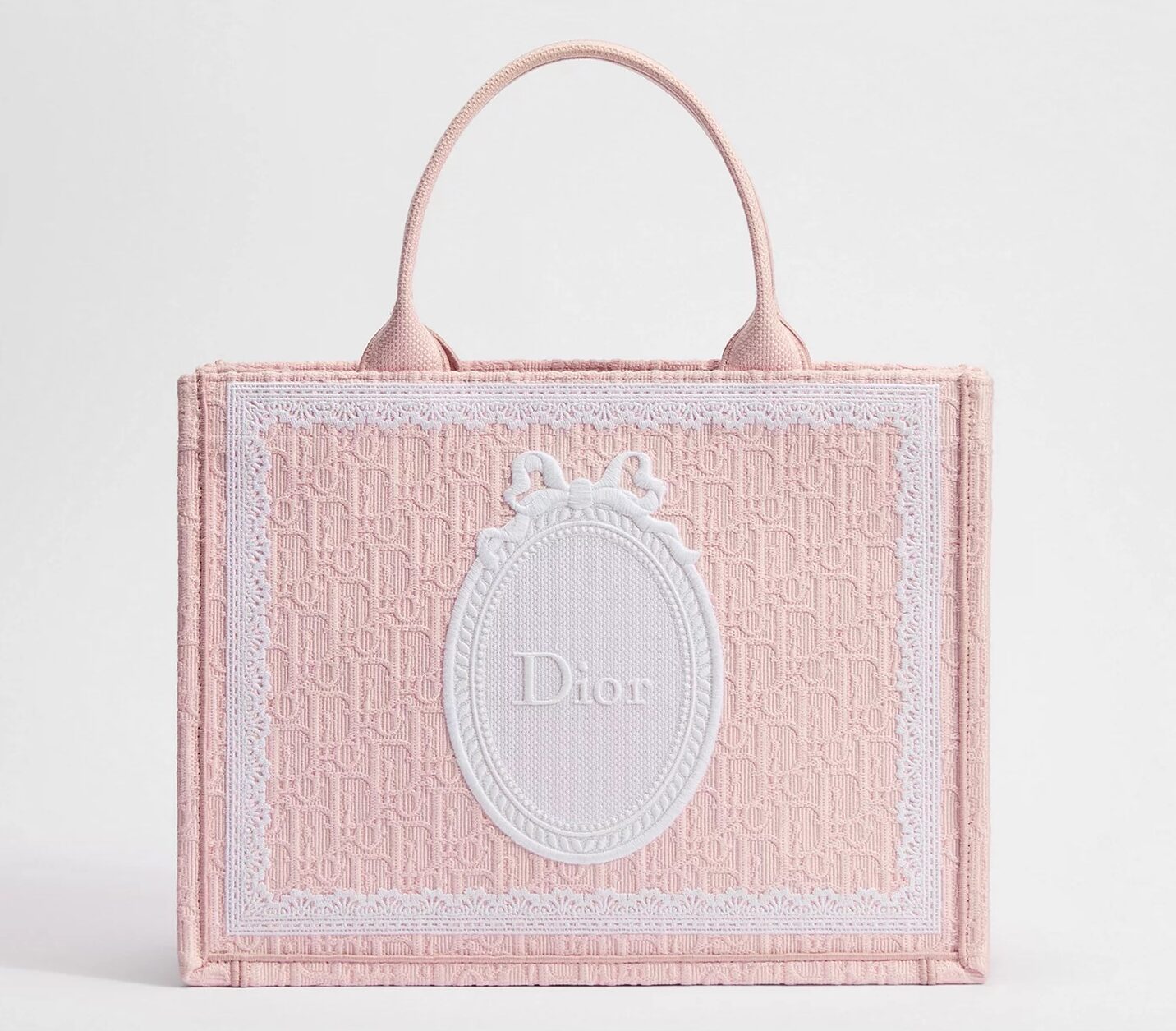 El distintivo Dior Book Tote se ha reinterpretado con el motivo Dior Oblique en jacquard, adornado con un marco de encaje y la firma Dior Médaillon, en una versión moderna de la opulencia del siglo XVIII.