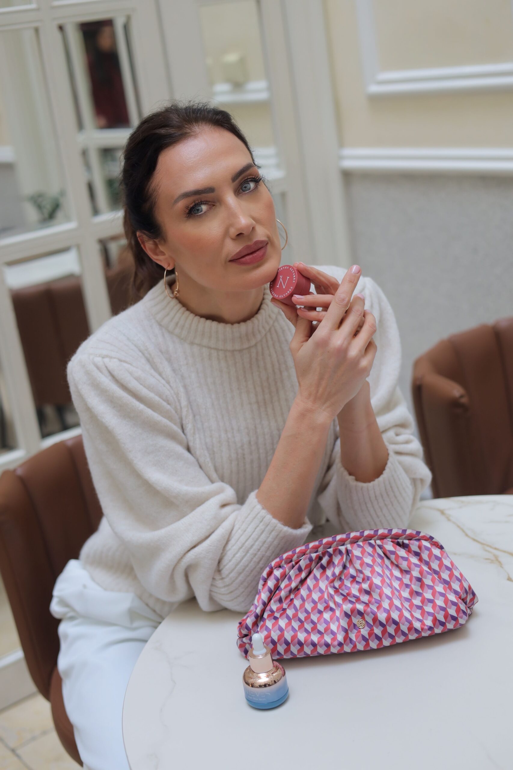 Pero hay algo más. Porque este set no se queda en el tratamiento. Como guiño final —y probablemente una de sus piezas más irresistibles— la colaboración incluye un bolso de edición limitada firmado por Lonbali. Un diseño versátil, pensado para llevarlo como pouch o como accesorio, que reinterpreta el icónico print BORN en una paleta vibrante de malva, frambuesa y blanco roto.