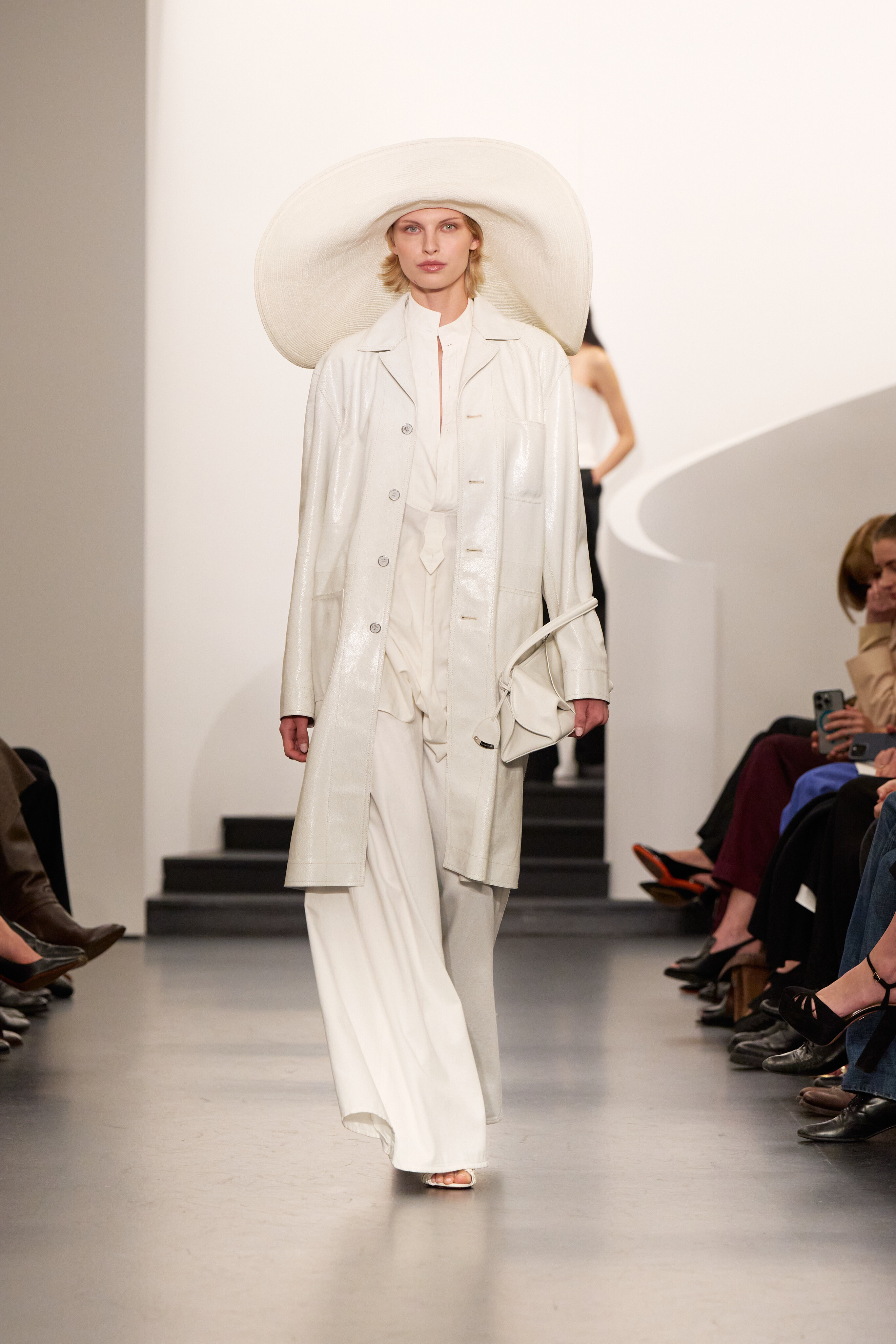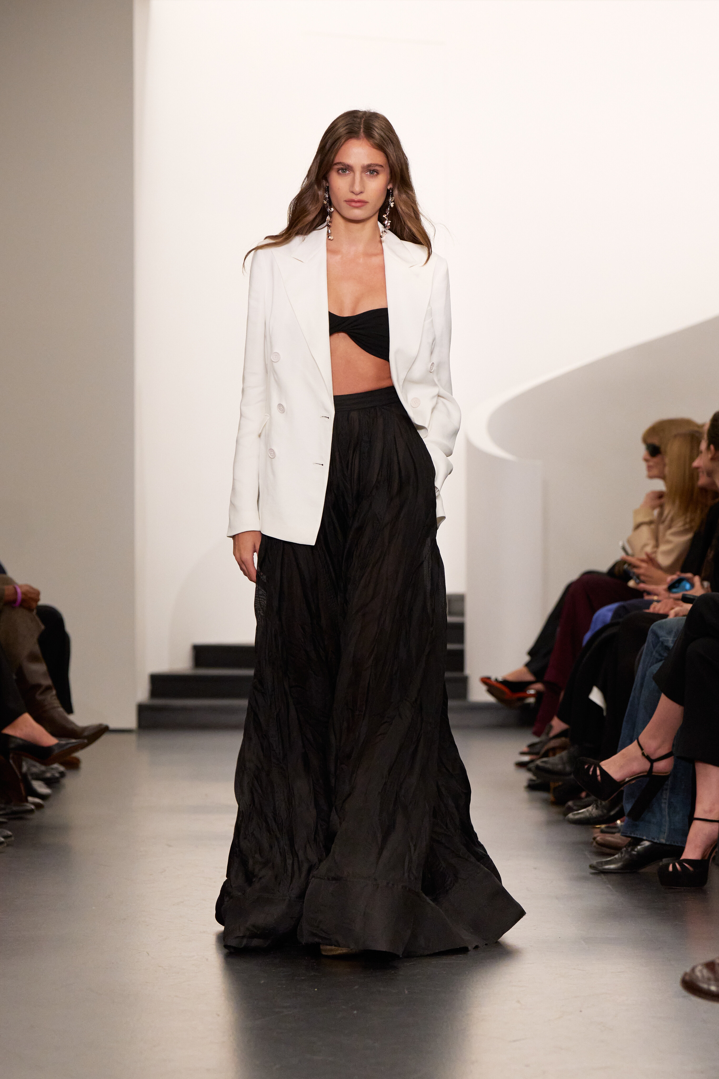 El lugar, un espacio en la sede de la compañía en el 650 de Madison, marca un “regreso a casa” para el desfile de la colección. La instalación —paredes blancas, escalera curva y asientos acolchados de líneas angulares; piso negro y lámparas de mimbre— fue diseñada para una simplicidad íntima, manteniendo el foco firmemente en la ropa.