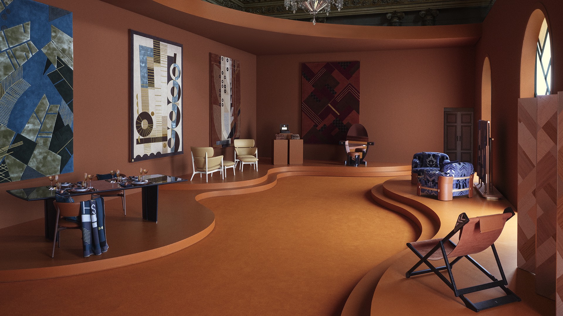 Comenzando con un mantel rojo y dorado inspirado en un diseño de encuadernación de Pierre Legrain, que evoca las líneas gráficas y minimalistas tan características de aquella época, se despliega una colección de vajilla, accesorios y velas. En el suelo, una gran alfombra de la colección Pierre Legrain Homage impone su ritmo y geometría.