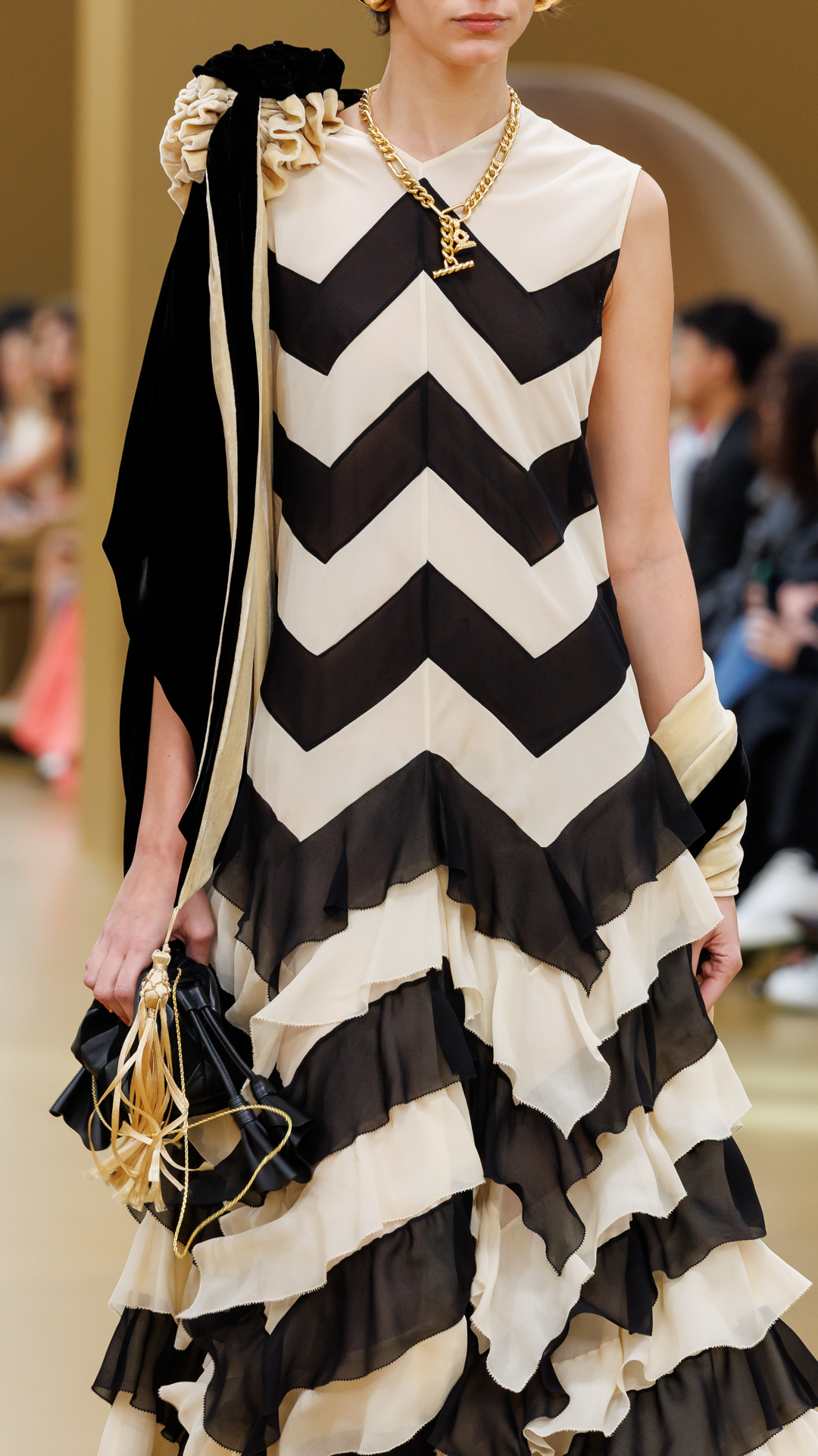 Las influencias Art Déco se reflejan en los estampados y las siluetas. Los motivos dibujados a mano cobran vida en los diseños de seda con aberturas y los vestidos de terciopelo recuerdan a la época con sus cortes geométricos y cascadas de georgette de seda.