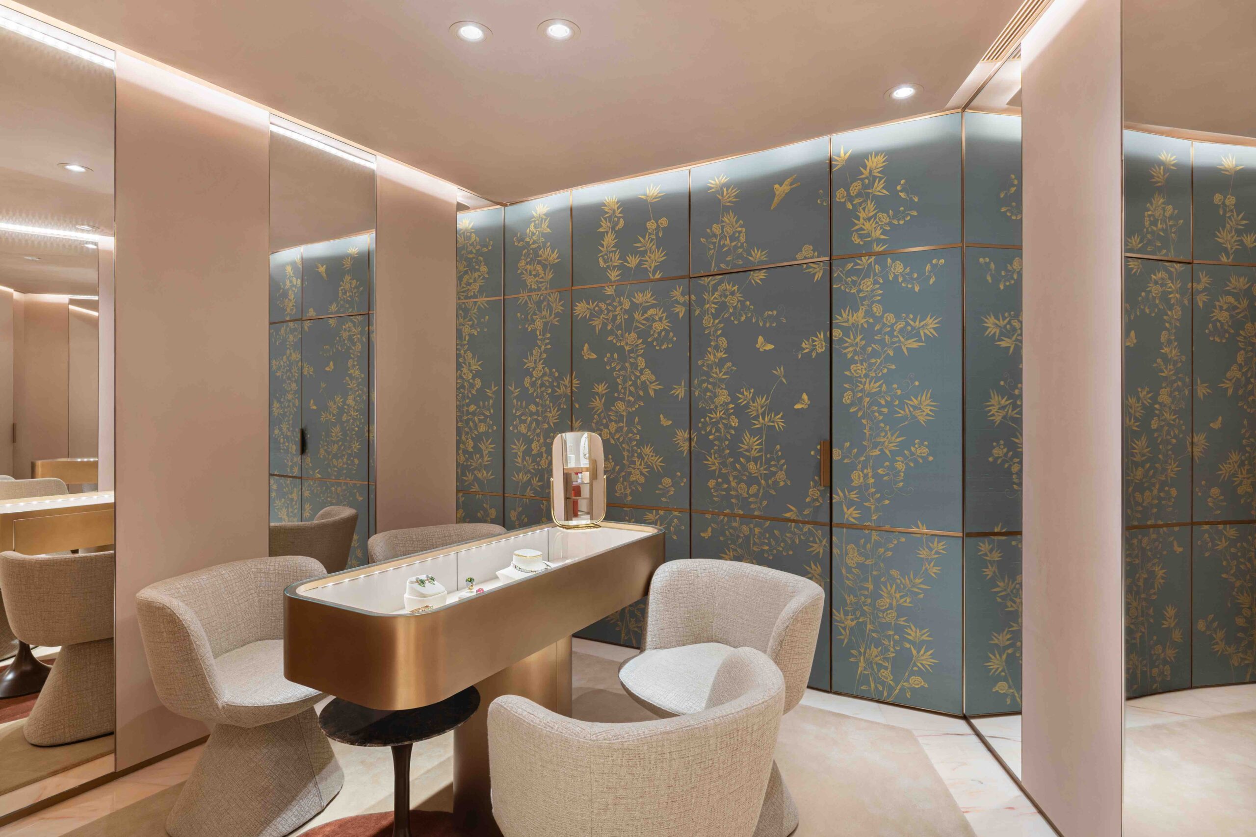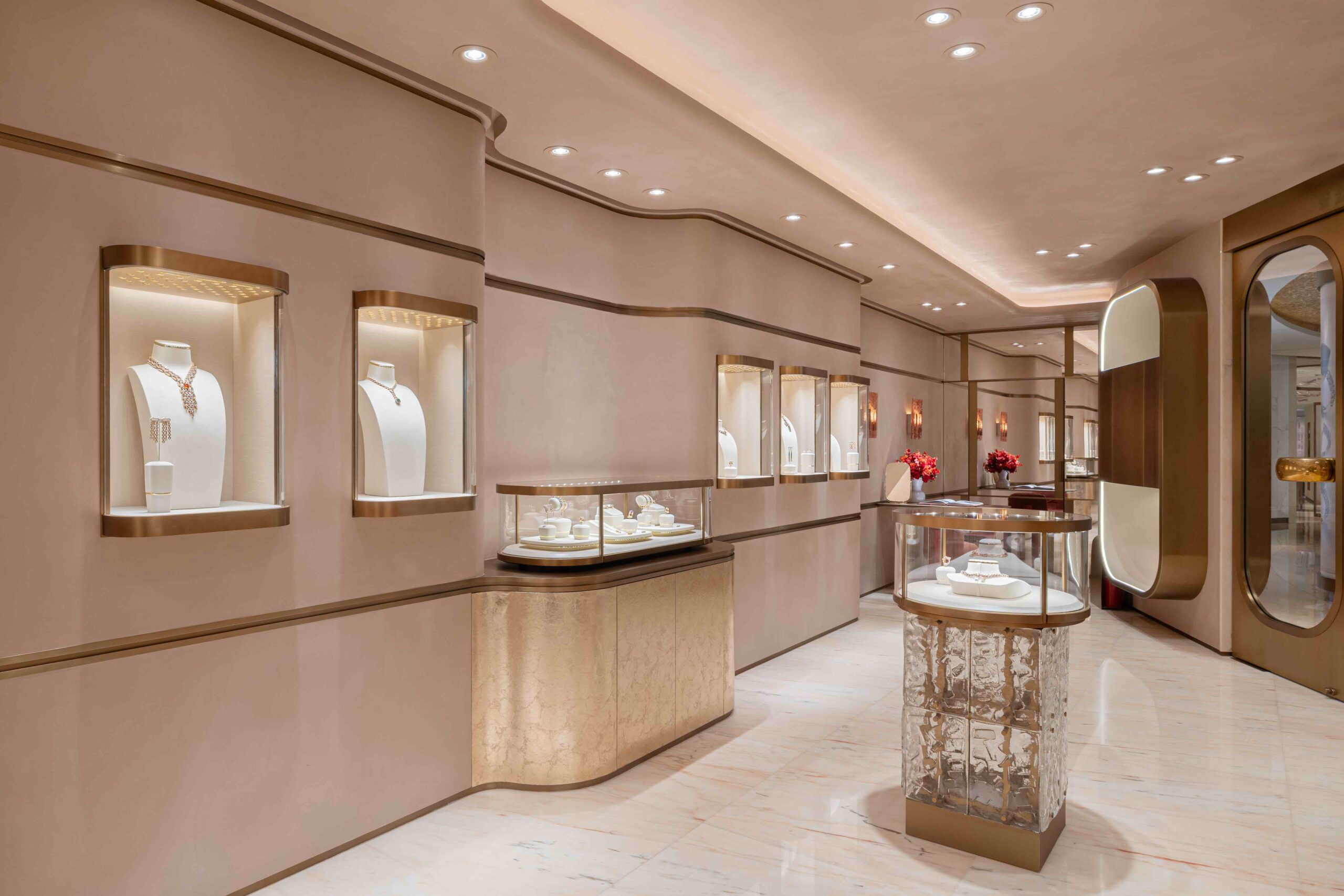 Diseñada como un homenaje contemporáneo a la artesanía italiana, la nueva boutique invita a los visitantes al universo Pomellato con tonos cálidos, elegantes suelos de mármol rosa e icónicos elementos de mobiliario, cada detalle realizado por destacados artistas y artesanos italianos. La sofisticada estructura dorada y las vitrinas curvas crean un ambiente íntimo y majestuoso, en el que cada joya se exhibe como una obra de arte. El exquisito papel pintado de la colección Gold Bamboo Garden de MISHA Milano —pintado a mano en China— reviste las paredes del salón privado, mientras que la icónica butaca Botolo, diseñada por Cini Boeri para Arflex, ofrece un asiento cargado de herencia del diseño italiano.