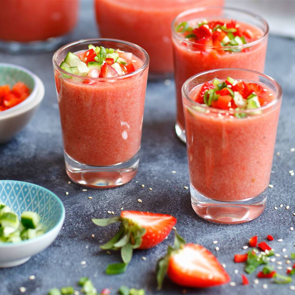 Tritura todo junto hasta conseguir una textura fina. Pásalo por colador si quieres un acabado más delicado. Sirve muy frío, con un chorrito extra de aceite virgen y una fresa laminada para decorar.