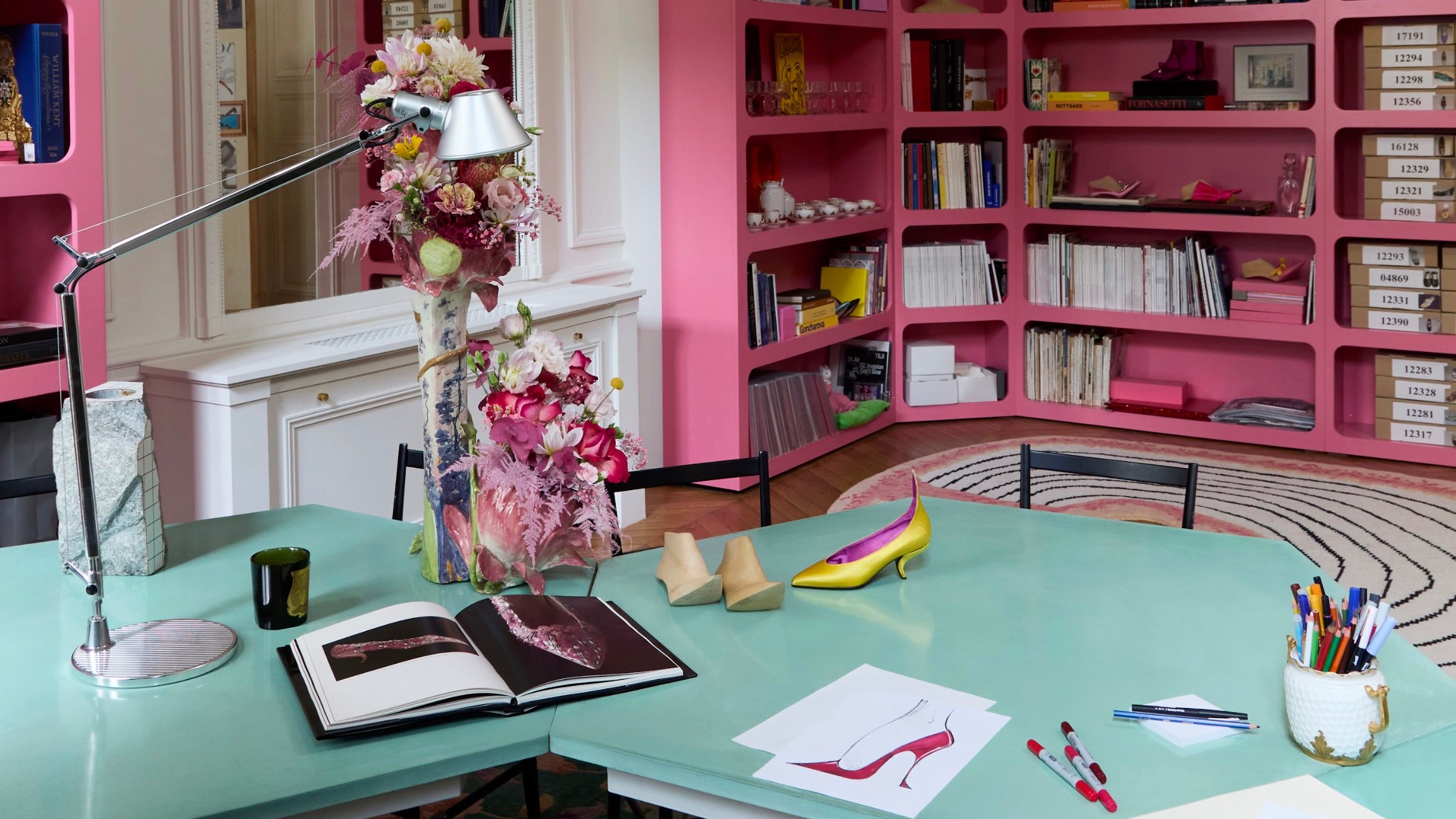 El despacho del Director Creativo Gherardo Felloni revela su sensibilidad parisina ecléctica. Tonos rosa y verde enmarcan una alfombra china Art Déco, butacas antiguas y un escritorio escultórico de Duccio Maria Gambi. Estanterías con cajas de archivo de zapatos recuerdan sus primeras exploraciones. Detalles personales, un retrato de perro, tazas vintage, libros de arte y jardines, convierten el estudio en un atelier vivo donde el legado inspira nuevas visiones.
