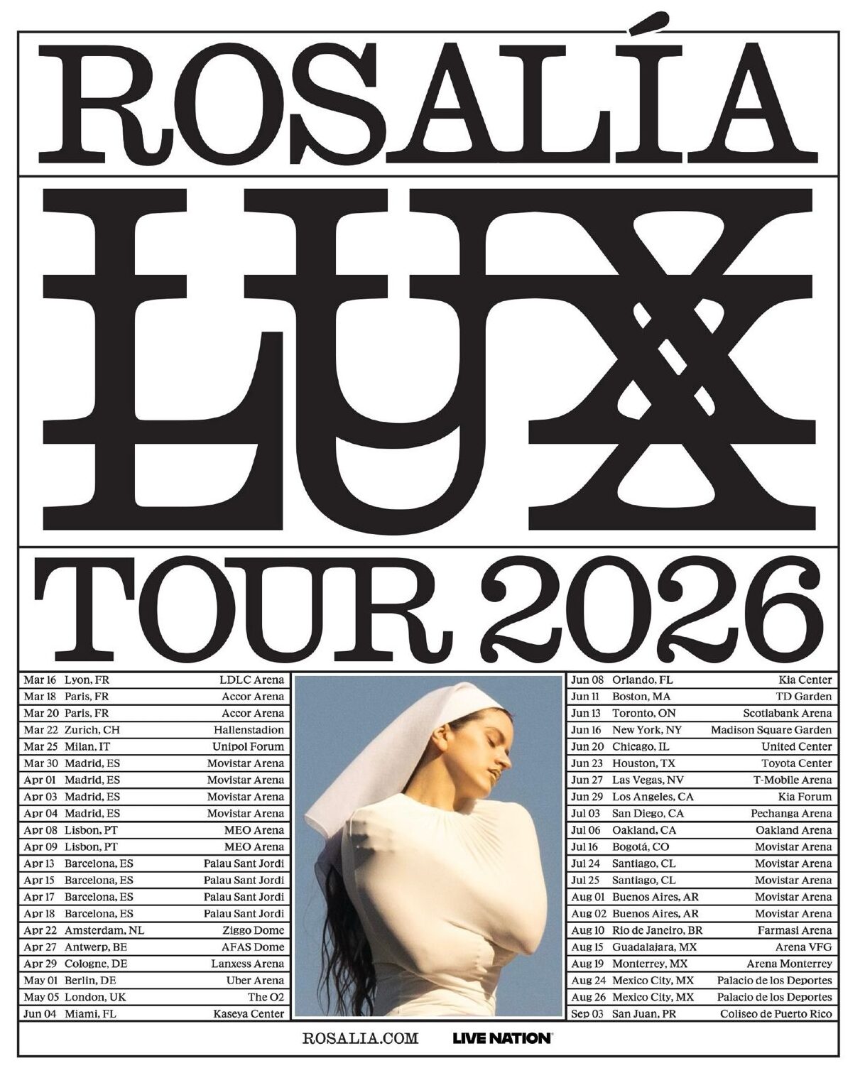 El fenómeno LUX, de Rosalía, no es solo una cuestión de cifras, sino de impacto cultural: desde su primera escucha, el álbum invita a un viaje sonoro donde la artista fusiona raíces flamencas con electrónica, pop y vanguardia experimental. Es el debut más grande para un álbum en español en Spotify, obteniendo más de 42 millones de reproducciones en su primer día, así que será un enorme privilegio para los fans presenciarlo en vivo. Esto gracias a que Rosalía ha anunciado el LUX Tour 2026, ¡y estamos emocionados!