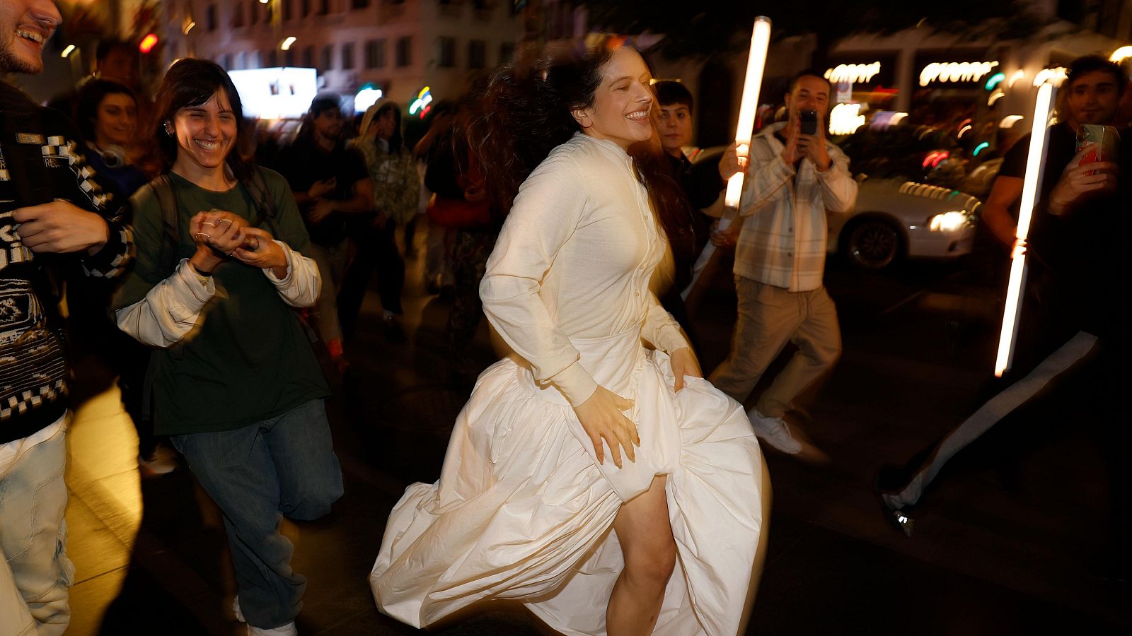 Se presentó vestida de blanco, con referencias monacales y un halo dorado en el cabello. El ambiente fue mezcla de misa moderna y concierto íntimo: orquesta, luces apagadas, megáfono y una multitud convocada por redes para presenciar el momento en el centro madrileño.