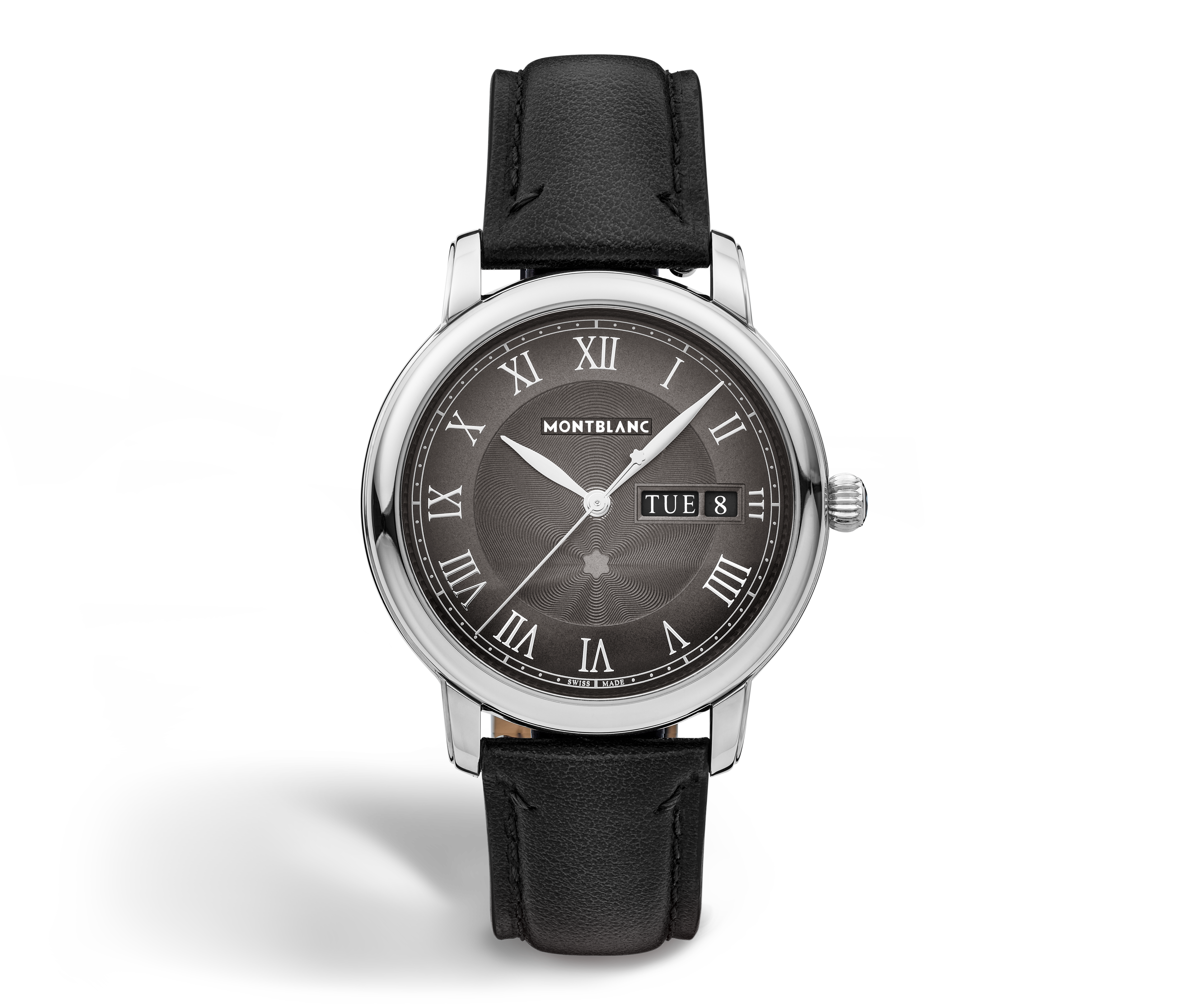 El reloj Montblanc Star Legacy Automatic Day & Date, un modelo clásico a la vez que contemporáneo, encarna el equilibrio entre dos identidades complementarias. El reloj presenta una esfera de color antracita con un motivo de estrella guilloché en expansión, números romanos rodiados y unas elegantes agujas en forma de hoja para la hora, los minutos, los segundos y la fecha. Cuenta con un movimiento automático MB24.28, una caja de 39 mm de acero inoxidable en forma de guijarro y un reverso de caja abierto que revela el peso oscilante en el interior. El reloj se completa con una correa intercambiable en piel de becerro, inspirada en la forma puntiaguda de un plumín.