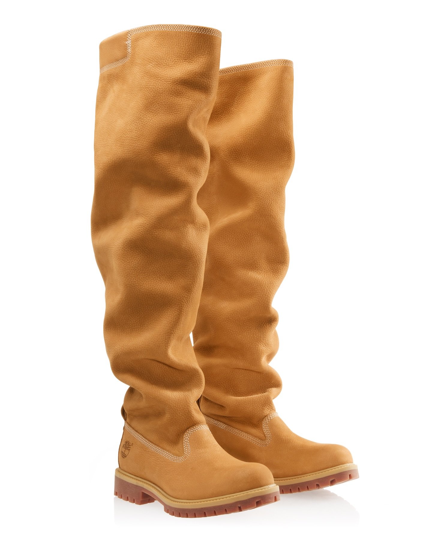 El resultado es la Timberland® x TELFAR Tall Premium. Una bota 26-inch sin estructura, confeccionada en piel nobuk granulada, disponible en tonos trigo y negro. Su diseño versátil permite jugar con la silueta: puede superar la rodilla o caer de manera natural, arrugarse, doblarse e incluso plegarse, dejando al descubierto un interior suave adornado con especificaciones técnicas grabadas a fuego sobre un aterciopelado ante.