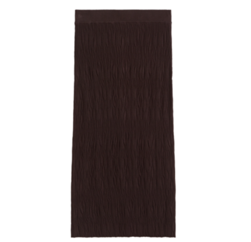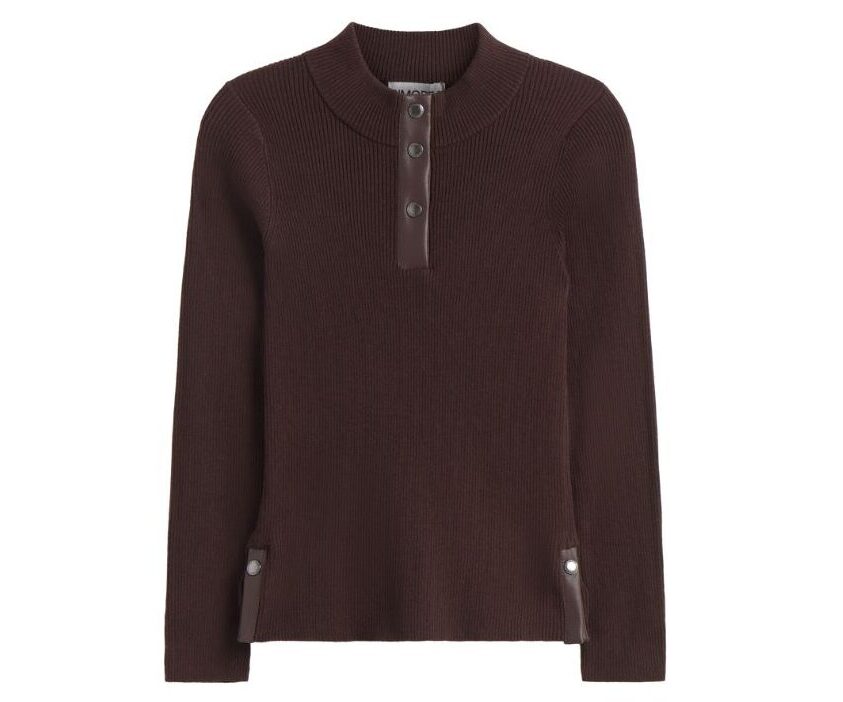 Por último, una apuesta por la sencillez, la discreción y el clásico color marrón chocolate. Para ello, este jersey de estilo polo, confeccionado en un acogedor tejido de canalé, que combina a la perfección con una falda midi drapeada. Una combinación cómoda y elegante para estilizar la figura y conseguir este contraste de texturas capaz de convertir un look sencillo en uno que querrás reformular sin parar.