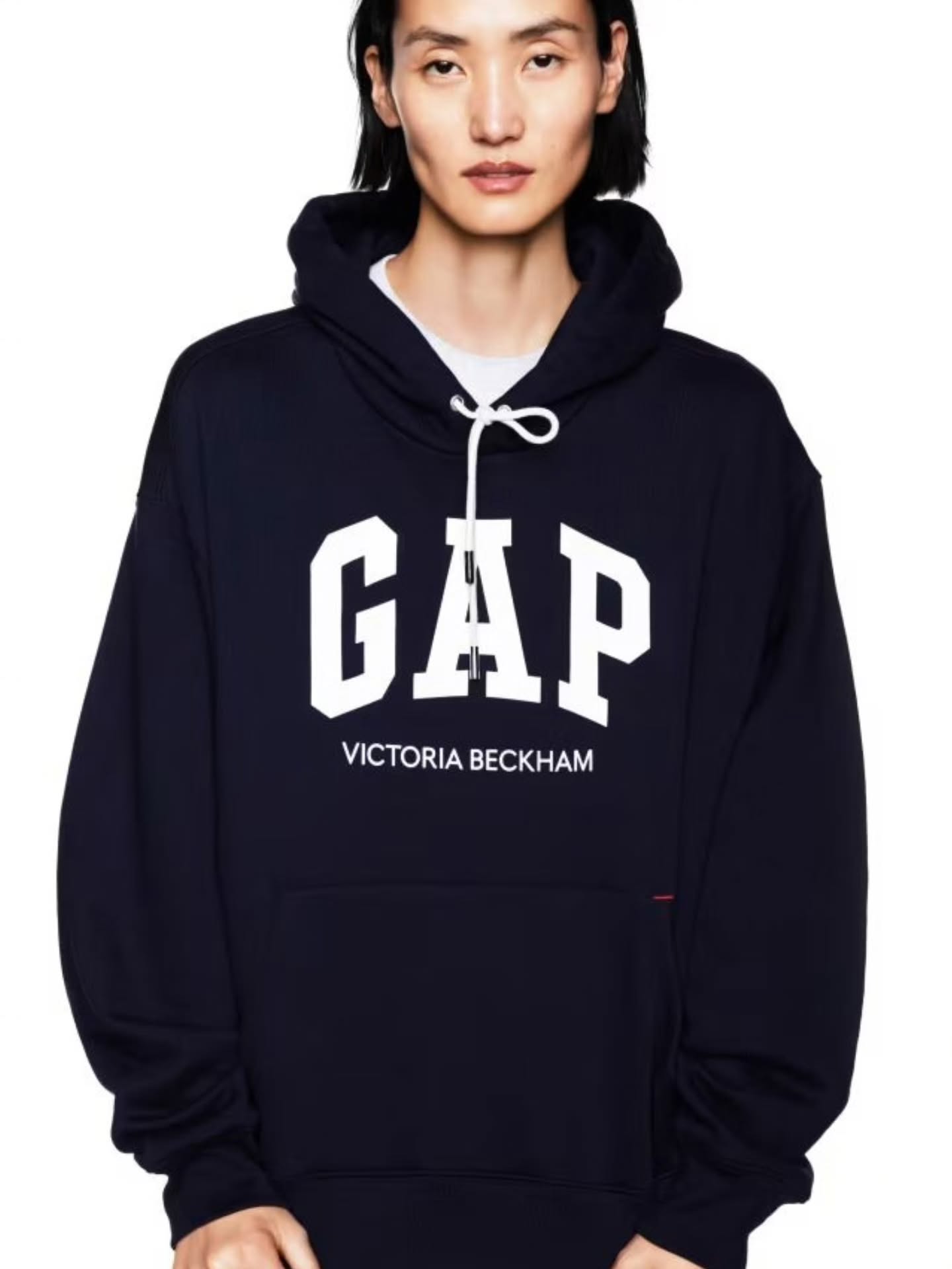 La colección también incluye pantalones capri, una referencia al estilo popularizado por Sarah Jessica Parker en un anuncio de Gap de 2004. Además, incluye una sudadera con capucha azul marino que presenta todos los elementos característicos de este básico de los 90, como el bolsillo canguro y los cordones ajustables; pero esta vez, el logotipo del arco de Gap con su tipografía Spire se sitúa sobre la marca de Beckham.