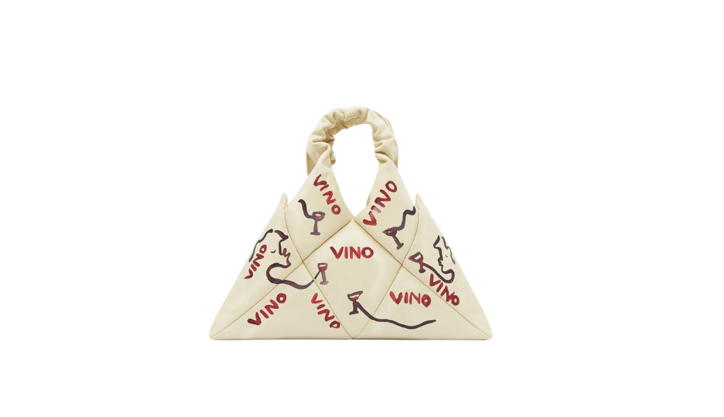 This RECO Paris’ hand-painted playfully sophisticated handbag is featured in its signature triangular silhouette. Complete with a delectable gold strap, this small sized purse also doubles as a subtle crossbody. An ode to the act of sharing a glass of wine with friends, this piece personifies the brand’s shared joy values.