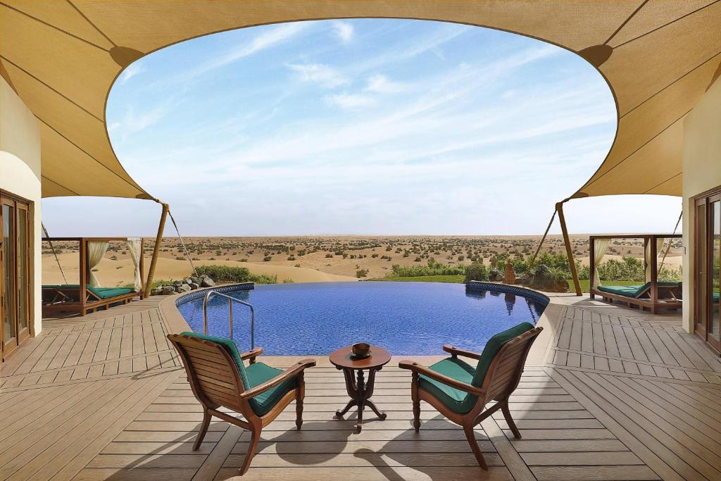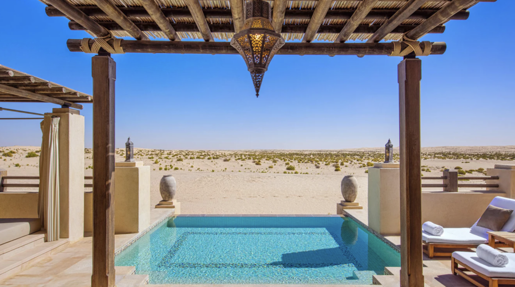 For those seeking a private escape in the desert, The Ritz-Carlton Al Wadi Desert offers the perfect experience. The resort’s tented villas are sprawled across the desert oasis and come with private pools, shaded outdoor spaces, and stunning traditional interiors. With opportunities for birdwatching, cycling, or relaxing spa treatments, guests can enjoy the serene desert landscape while indulging in the best service.